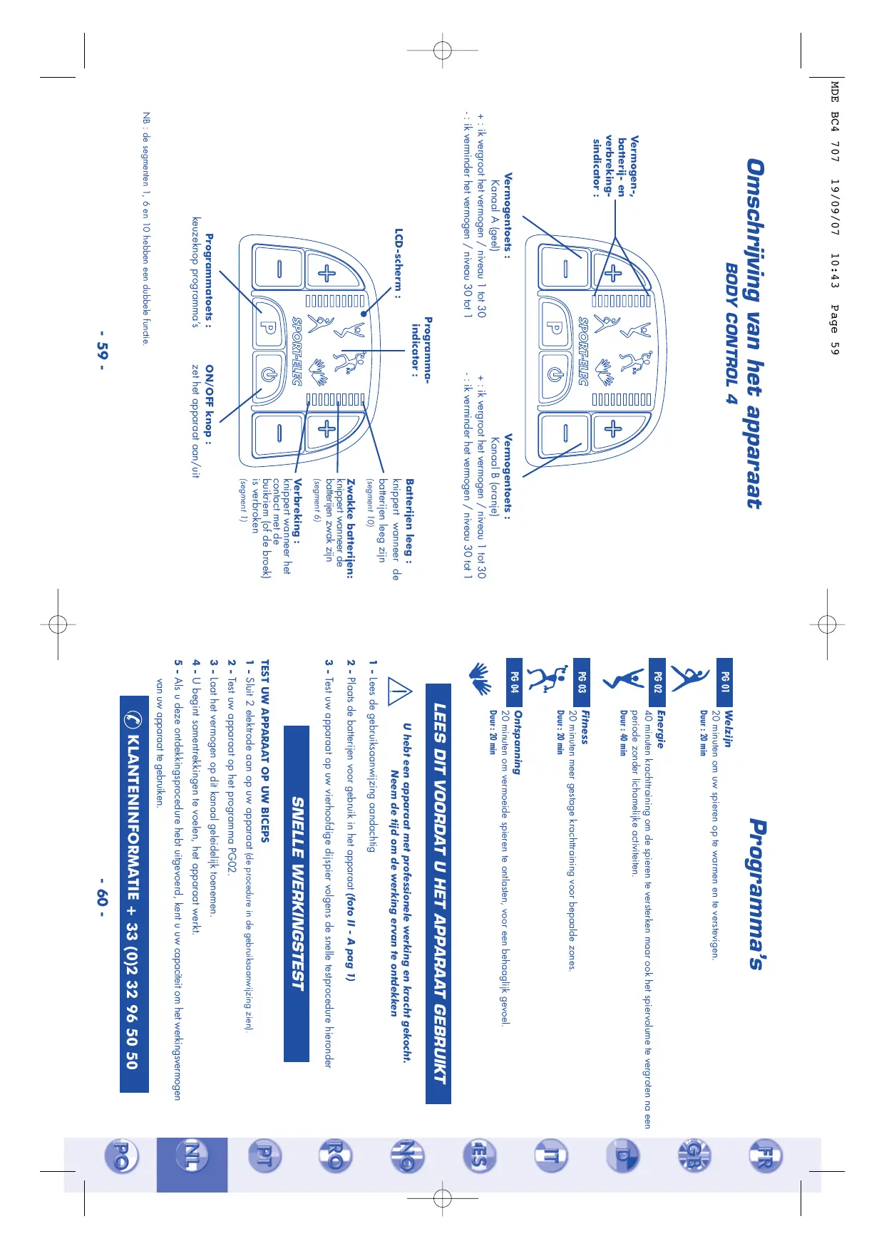PG 01 PG 02 PG 03 PG 04 Welzijn Programma’s 20 minuten om uw spieren op te warmen en te verstevigen. Duur : 20 min Energie 40 minuten krachttraining om de spieren te versterken maar ook het spiervolume te vergroten na een periode zonder lichamelijke activiteiten. Duur : 40 min Fitness 20 minuten meer gestage krachttraining voor bepaalde zones. Duur : 20 min Ontspanning 20 minuten om vermoeide spieren te ontlasten, voor een behaaglijk gevoel. Duur : 20 min LEES DIT VOORDAT U HET APPARAAT GEBRUIKT U hebt een apparaat met professionele werking en kracht gekocht. Neem de tijd om de werking ervan te ontdekken