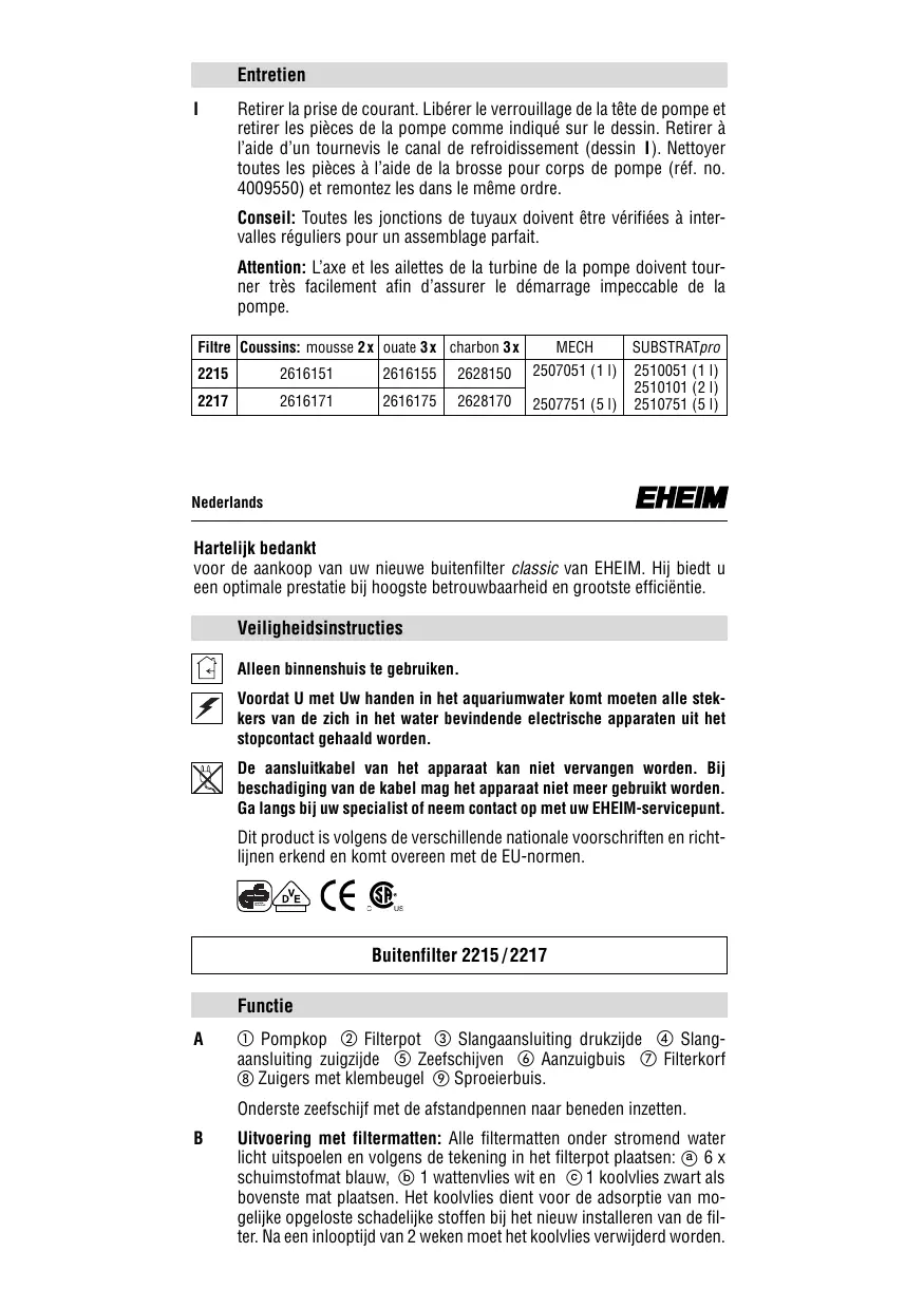 MECH SUBSTRATpro 2507051 (1 l) 2510051 (1 l) 2510101 (2 l) 2507751 (5 l) 2510751 (5 l) Nederlands Hartelijk bedankt voor de aankoop van uw nieuwe buitenfilter classic van EHEIM. Hij biedt u een optimale prestatie bij hoogste betrouwbaarheid en grootste efficiëntie. Veiligheidsinstructies Alleen binnenshuis te gebruiken. Voordat U met Uw handen in het aquariumwater komt moeten alle stekkers van de zich in het water bevindende electrische apparaten uit het stopcontact gehaald worden. De aansluitkabel van het apparaat kan niet vervangen worden. Bij beschadiging van de kabel mag het apparaat niet meer gebruikt worden. Ga langs bij uw specialist of neem contact op met uw EHEIM-servicepunt. Dit product is volgens de verschillende nationale voorschriften en richtlijnen erkend en komt overeen met de EU-normen. geprüfte Sicherheit Buitenfilter 2215 / 2217 Functie