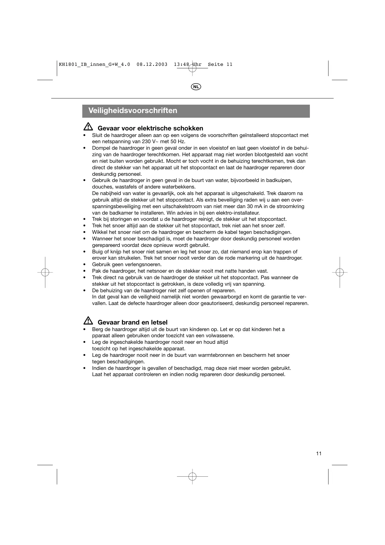 Indien de haardroger is gevalen of beschadigd, mag deutsche nicht meer worden gebruikt. Laat het apparaat controleren en indien nodig repareren door deskundig personeel.