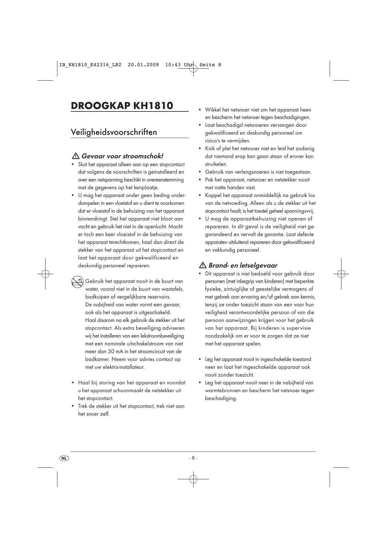 - Dit apparaat is niet bedoeld voor gebruik door personen (met inbegrip van kinderen) met beperkte fysieke, zintuiglijke of geestelijke vermogens of met gebrek aan ervaring en/of gebrek aan kennis, tenzij ze onder toezicht staan van een voor hun veiligheid verantwoordelijke persoon of van die persoon aanwijzingen krijgen voor het gebruik van het apparaat. Bij kinderen is supervisie noodzakelijk om er voor te zorgen dat ze niet met het apparaat spelen. Gebruik het apparaat nooit in de buurt van water, vooral niet in de buurt van wastafels, badkuipen of vergelijkbare reservoirs. De nabijheid van water vormt een gevaar, ook als het apparaat is uitgeschakeld. Haal daarom na elk gebruik de stekker uit het stopcontact. Als extra beveiliging adviseren wij het installeren van een lekstroombeveiliging met een nominale uitschakelstroom van niet meer dan 30 mA in het stroomcircuit van de badkamer. Neem voor advies contact op met uw elektra-installateur.