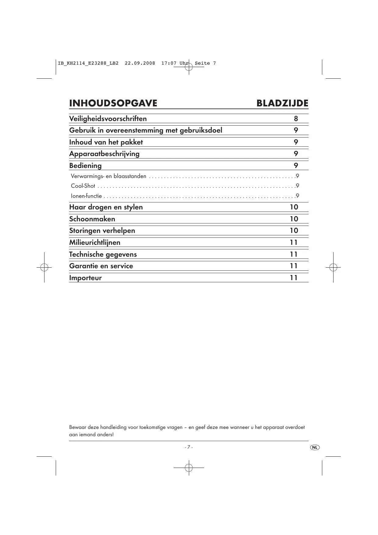 17:07 Uhr Milieurichtlijnen Garantie en service Deponeer het apparaat in geen geval bij het normale huisvuil. Voor dit product geldt de Europese richtlijn 2002/96/EG. Voer het toestel af via een erkend afvalverwerkingsbedrijf of via uw gemeentereiniging. Neem de bestaande voorschriften in acht. Neem in geval van twijfel contact op met uw gemeentereinigingsdienst. Zorg voor een milieuvriendelijk afvoeren van alle verpakkingsmaterialen. Technische gegevens Netspanning: Nominaal vermogen: Beveiligingsklasse : Seite 11 220-240 V ~ 50 Hz 2000 W II / U heeft op dit apparaat 3 jaar garantie vanaf de aankoopdatum. Het apparaat is met de grootst mogelijke zorg vervaardigd en voorafgaand aan de levering nauwkeurig gecontroleerd. Bewaar a.u.b. de kassabon als aankoopbewijs. Mocht u aanspraak willen maken op de garantie, neem dan telefonisch contact op met uw serviceadres. Alleen dan kan het gratis inzenden van uw product worden gewaarborgd. De garantie geldt uitsluitend voor materiaal- of fabricagefouten, niet voor aan slijtage onderhevige delen of voor beschadigingen van breekbare onderdelen, bijv. schakelaars of accu's. Het product is uitsluitend bestemd voor privé-gebruik en niet voor bedrijfsmatige doeleinden. Bij verkeerd gebruik en ondeskundige behandeling, bij gebruik van geweld en bij reparaties die niet door ons geautoriseerd servicefiliaal zijn uitgevoerd, vervalt de garantie. Uw wettelijke rechten worden door deze garantie niet ingeperkt. Kompernass Service Netherland Tel.: 0900 1240001 e-mail: support.nl@kompernass.com Kompernass Service Belgium Tel.: 070350315 e-mail: support.be@kompernass.com Importeur KOMPERNASS GMBH BURGSTRASSE 21 44867 BOCHUM, GERMANY www.kompernass.com