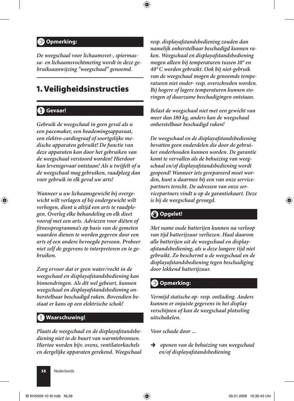 Voeding weegschaal: × , V AA Voeding displayafstandsbediening: × , V AAA Max. draagvermogen/max. meetbaar gewicht: kg/ lb Min. meetbaar gewicht: kg/, lb Tolerantiebereik < kg: max. g Tolerantiebereik > kg: % +/- , kg Meetmethode: bio-elektrische impedantieanalyse via vier voetsensoren Interval bij gewichtsmeting: , kg/, lb Meting vetpercentage: – % Interval bij vetpercentagemeting: , % Meting vochtpercentage: – % Interval bij vochtpercentagemeting: , % Meting spiermassapercentage: – % Interval spiermassapercentage: , % Weergave calorieënbehoefte: in kcal Interval calorieënbehoefteweergave: kcal Invoermogelijkheden lichaamslengte: – cm/'"–'" Invoermogelijkheden leeftijd: – jaar geheugenplaatsen voor persoonlijke gegevens Functies: alleen gewichtsmeting/gewichts-, lichaamsvet-, spiermassa- en lichaamsvochtpercentage-meting/meting van de globale dagelijkse calorieënbehoefte/weergave globale conditie Maateenheden instelbaar: kg/lb, cm/inch Batterijstatusweergave Overbelastingsweergave Foutmelding Nederlands IB KH5509-10 W.indb NL59