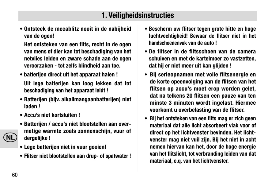 - Ontsteek de mecablitz nooit in de nabijheid van de ogen! Het ontsteken van een flits, recht in de ogen van mens of dier kan tot beschadiging van het netvlies leiden en zware schade aan de ogen veroorzaken - tot zelfs blindheid aan toe.