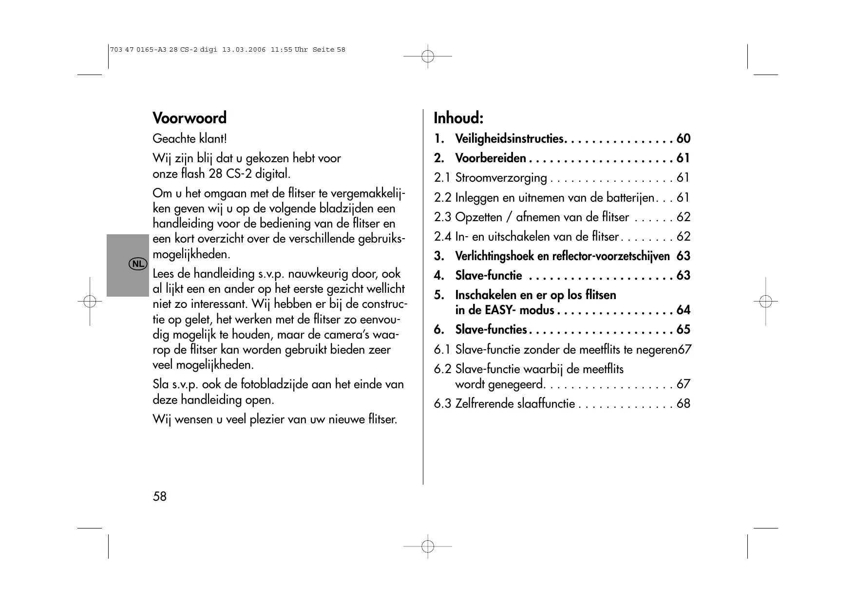 Om u het omgaan met de flitser te vergemakkelijken geben wij u op de volgende bladzijden een handleiding voor de bediening van de flitser en een kort overzicht over de verzillende gebruiksmogelijkheden.