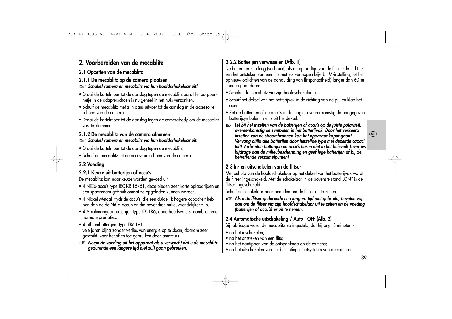 De mecabliz kan naar keuze worden gevoed uit: + ANiCd-accus type IEC KR 15/51, deze bieden zeer korte opladliden en een spaarzaam gebruik omdat ze opgeladen kunnen worden + 4 Nickel-Metaal-Hydride accus, die een duidelik hogere capaciteit heb- ben dan de de NiCd-accu's en die bovendhien milieuvriendeliker zijn + 4 Alkalimangaanbatterijen type IEC LR6, onderhoudsvrie stroombron voor normale prestaties. + 4 Lithiumbatterien, type FR6 L91, vele jaren bifna zonder verlies van energie op te slaan, daarom zeer geschikt. voor het af en toe gebruiken door amateurs. 1& Neem de voeding uit het apparaai als u verwacht dat u de mecablitz gedurende een langere tijd niet zult gaan gebruiken. A4AF-4 M 16.08.2007 16:09 Uhr Seite 39,