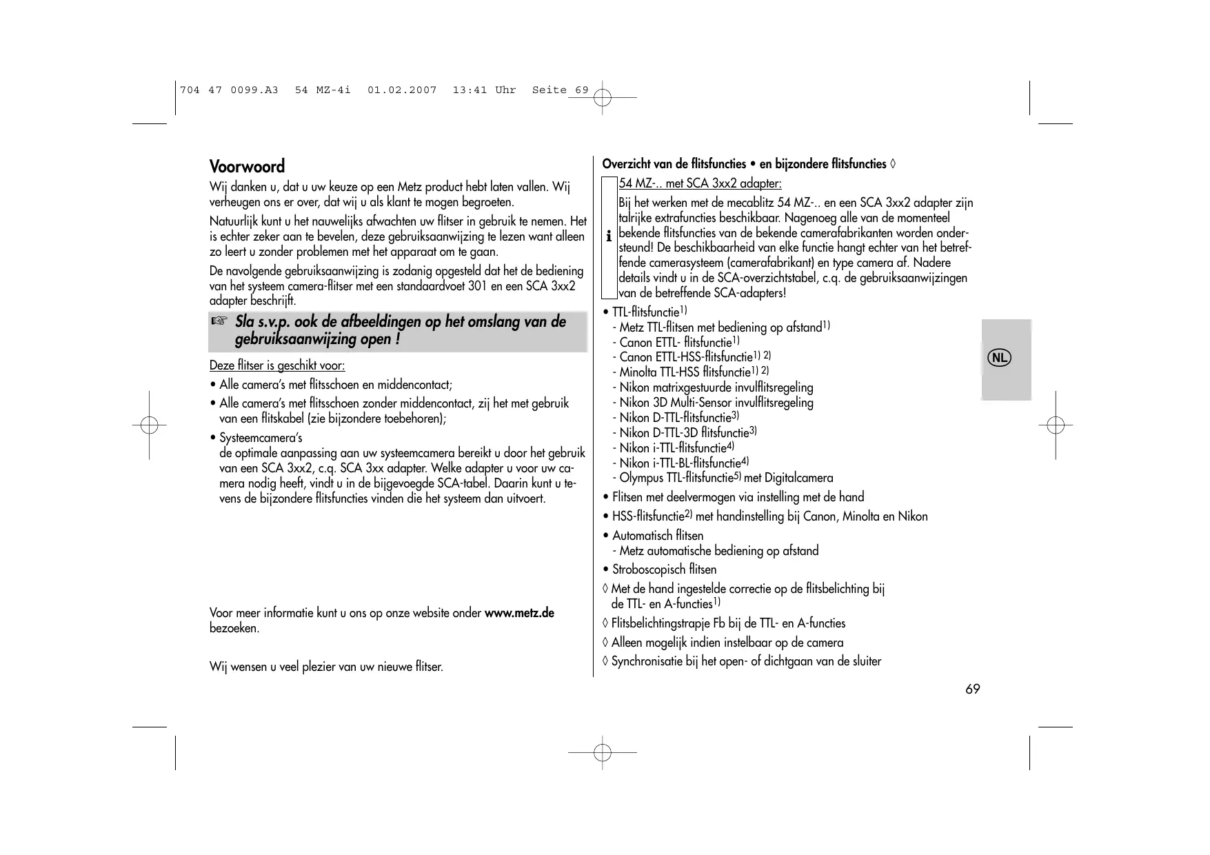 704 47 0099.A3 54 MZ-4i 01.02.2007 13:41 Uhr Voorwoord Wij danken v, dat u uw keuze op een Metz product hebt laten vallen. Wij verheugen ons er over, dat wi u als klant te mogen begroeten. Natuurlijk kunt u het nauweliks afwachten uw flitser in gebruik te nemen. Het is echter zeker aan te bevelen, deze gebruiksaanwijzing te lezen want alleen 20 leert u zonder problemen met het apparaat om te gaan. De navolgende gebruiksaanwijzing is zodanig opgesteld dat het de bediening van het see camera-fltser met een standaardvoet 301 en een SCA 3xx2 adapter beschrijft. “ Sla s.v.p. ook de afbeeldingen op het omslang van de gebruiksaanwijzing open ! Deze flitser is geschikt voor: + Alle cameras met flitsschoen en middencontact; + Alle camera's met flitsschoen zonder middencontact, zij het met gebruik van een flitskabel (zie bijzondere toebehoren]; + Systeemcamera's de optimale aanpassing aan uw systeemcamera bereikt u door het gebruik van een SCA 3xx2, c.q. SCA 3x adapter. Welke adapter u voor uw ca- mera nodig heef, vindi u in de bijgevoegde SCA-tabel. Daarin kunt u te- vens de bijzondere flitsfuncties vinden die het systeem dan uitvoert. Voor meer informatie kunt u ons op onze website onder www.metz.de bezoeken Wij wensen u veel plezier van uw nieuwe itser. Seite 69