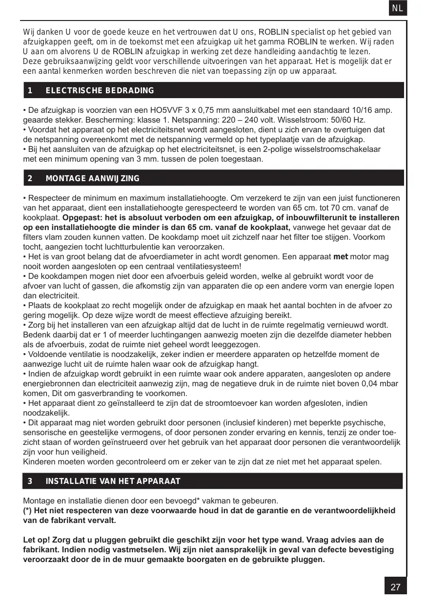Wij danken U voor de goede keuze en het vertrouwen dat U ons, ROBLIN specialist op het gebied van afzuigkappen geeft, om in de toekomst met een afzuigkap uit het gamma ROBLIN te werken. Wij raden U aan om alvorens U de ROBLIN afzuigkap in werking zet deze handleiding aandachtig te lezen. Deze gebruiksaanwijzing geldt voor verschillende uitvoeringen van het apparaat. Het is mogelijk dat er een aantal kenmerken worden beschreven die niet van toepassing zijn op uw apparaat.