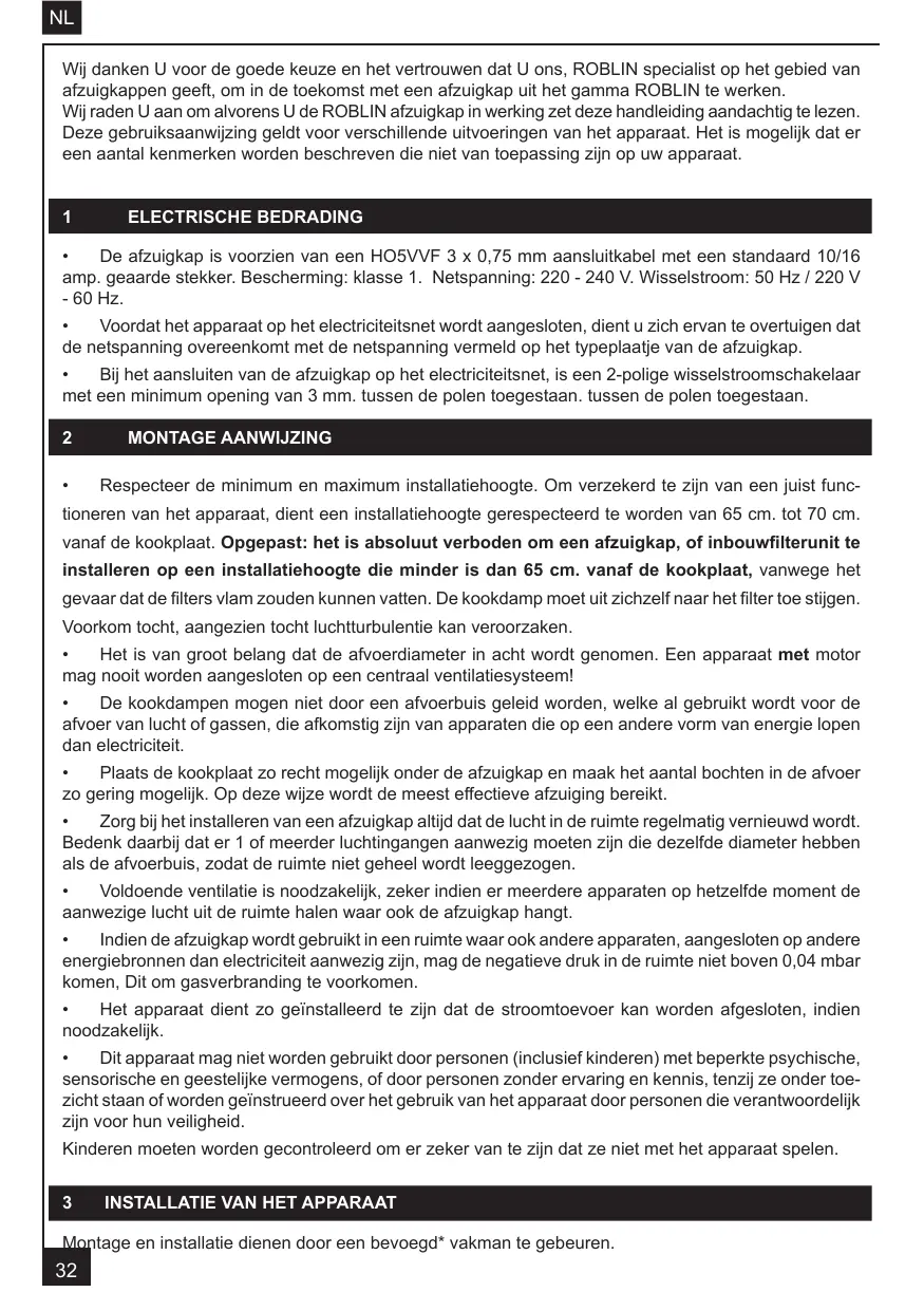 Wij danken U voor de goede keuze en het vertrouwen dat U ons, ROBLIN specialist op het gebied van afzuigkappen geeft, om in de toekomst met een afzuigkap uit het gamma ROBLIN te werken. Wijraden U aan om alvorens U de ROBLIN afzuigkap in werking zet deze handleïding aandachtig te lezen Deze gebruiksaanwijzing geldt voor verschillende uitvoeringen van het apparaat. Het is mogelik dat er een aantal kenmerken worden beschreven die niet van toepassing zijn op uw apparaat. 1 ELECTRISCHE BEDRADING + De afzuigkap is voorzien van een HOSVVF 3 x 0,75 mm aansluitkabel met een standaard 10/16 amp. geaarde stekker. Bescherming: klasse 1. Netspanning: 220 - 240 V. Wisselstroom: 50 Hz / 220 V - 60 Hz. + Voordat het apparaat op het electriciteitsnet wordt aangesloten, dient u zich ervan te overtuigen dat de netspanning overeenkomt met de netspanning vermeld op het typeplaatje van de afzuigkap. + Bij het aansluiten van de afzuigkap op het electriciteitsnet, is een 2-polige wisselstroomschakelaar met een minimum opening van 3 mm. tussen de polen toegestaan. tussen de polen toegestaan 2 MONTAGE AANWIJZING + Respecter de minimum en maximum installatiehoogte. Om verzekerd te zijn van een juist func- tioneren van het apparaat, dient een installatiehoogte gerespecteerd te worden van 65 cm. tot 70 cm: vanaf de kookplaat. Opgepast: het is absoluut verboden om een afzuigkap, of inbouwfilterunit te installeren op een installatiehoogte die minder is dan 65 cm. vanaf de kookplaat, vanwege het gevaar dat de filters vlam zouden kunnen vatten. De kookdamp moet uit zichzelf naar het filter toe stijgen: Voorkom tocht, aangezien tocht luchtturbulentie kan veroorzaken. + Het is van groot belang dat de afvoerdiameter in acht wordt genomen. Een apparaat met motor mag nooit worden aangesloten op een central ventilatiesysteem! + De kookdampen mogen niet door een afvoerbuis geleid worden, welke al gebruikt wordt voor de afvoer van lucht of gassen, die afkomstig zin van apparaten die op een andere vorm van energie lopen dan electriciteit. + Plaats de kookplaat zo recht mogelik onder de afzuigkap en maak het aantal bochten in de afvoer 20 gering mogelik. Op deze wijze wordt de meest effectieve afzuiging bereikt. + Zorgbijhetinstalleren van een afzuigkap altijd dat de luchtin de ruimte regelmatig vernieuwd wordt. Bedenk daarbij dat er 1 of meerder luchtingangen aanwezig moeten zijn die dezelfde diameter hebben als de afvoerbuis, zodat de ruimte niet geheel wordt leeggezogen. + Voldoende ventilatie is noodzakelik, zeker indien er meerdere apparaten op hetzelfde moment de aanwezige lucht uit de ruimte halen waar ook de afzuigkap hangt. + Indien de afzuigkap wordt gebruikt in een ruimte waar ook andere apparaten, aangesloten op andere energiebronnen dan electriciteit aanwezig zijn, mag de negatieve druk in de ruimte niet boven 0,04 mbar komen, Dit om gasverbranding te voorkomen. + Het apparaat dient zo geïnstalleerd te zin dat de stroomtoevoer kan worden afgesloten, indien noodzakelik. + Ditapparaat mag niet worden gebruikt door personen (inclusief kinderen) met beperkte psychische, sensorische en geestelike vermogens, of door personen zonder ervaring en kennis, tenzij ze onder toe- Zicht staan of worden geïnstrueerd over het gebruik van het apparaat door personen die verantwoordelijk Zin voor hun veiligheid. Kinderen moeten worden gecontroleerd om er zeker van te zijn dat ze niet met het apparaat spelen.