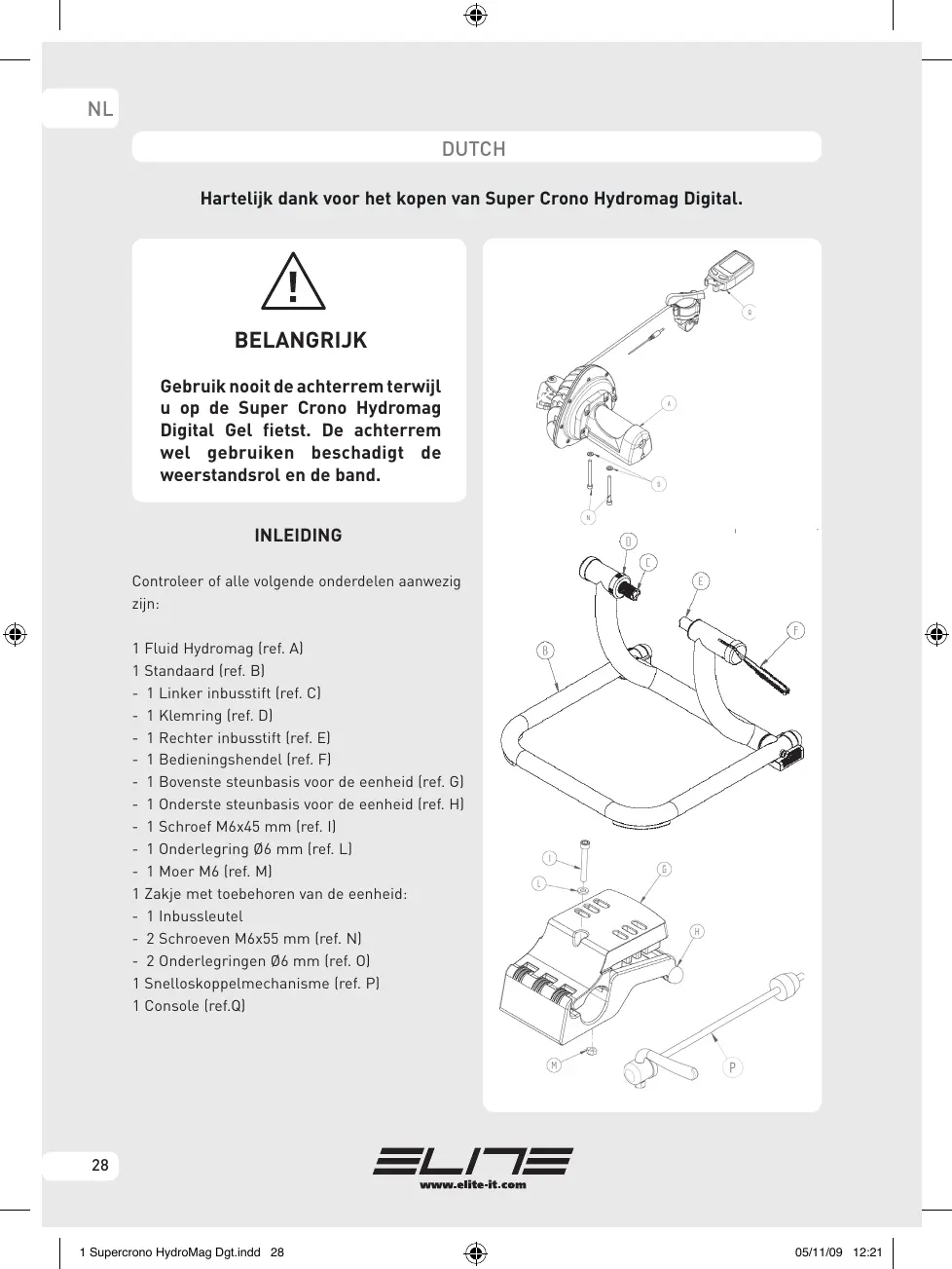 DUTCH Hartelijk dank voor het kopen van Super Crono Hydromag Digital. BELANGRIJK Gebruik nooit de achterrem terwijl u op de Super Crono Hydromag Digital Gel fietst. De achterrem wel gebruiken beschadigt de weerstandsrol en de band. INLEIDING Controleer of alle volgende onderdelen aanwezig zijn: 1 Fluid Hydromag (ref. A) 1 Standaard (ref. B) - 1 Linker inbusstift (ref. C) - 1 Klemring (ref. D) - 1 Rechter inbusstift (ref. E) - 1 Bedieningshendel (ref. F) - 1 Bovenste steunbasis voor de eenheid (ref. G) - 1 Onderste steunbasis voor de eenheid (ref. H) - 1 Schroef M6x45 mm (ref. I) - 1 Onderlegring Ø6 mm (ref. L) - 1 Moer M6 (ref. M) 1 Zakje met toebehoren van de eenheid: - 1 Inbussleutel - 2 Schroeven M6x55 mm (ref. N) - 2 Onderlegringen Ø6 mm (ref. O) 1 Snelloskoppelmechanisme (ref. P) 1 Console (ref.Q)