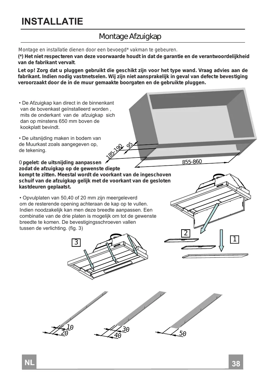 INSTALLATIE Montage Afzuigkap Montage en installatie dienen door een bevoegd* vakman te gebeuren. (+) Het niet respecteren van deze voonwaarde houdt in dat de garantie en de verantwoordelikheid van de fabrikant vervalt. Let op! Zorg dat u pluggen gebruikt die geschikt zijn voor het type wand. Vraag advies aan de fabrikant. Indien nodig vastmetselen. Wij zijn niet aansprakelijk in geval van defecte bevestiging veroorzaakt door de in de muur gemaakte boorgaten en de gebruikte pluggen. + De Afzuigkap kan direct in de binnenkant van de bovenkast geïnstalleerd worden , mits de onderkant van de afzuigkap sich dan op minstens 650 mm boven de kookplatt bevindt. + De uitsnijding maken in bodem van de Muurkast zoals aangegeven op, de tekening. 0 pgelet: de uitsnijding aanpassen zodat de afzuigkap op de gewenste diepte kompt te zitten. Meestal wordt de voorkant van de ingeschoven schuif van de afzuigkap gelijk met de voorkant van de gesloten kastdeuren geplaatst. + Opvuiplaten van 50,40 of 20 mm zijn meergeleverd om de resterende opening achteraan de kap op te vullen. Indien noodzakelik kan men deze breedte aanpassen. Een combinatie van de drie platen is mogelik om tot de gewenste breedte te komen. De bevestigingsschroeven vallen tussen de verlichting. (fig. 3) a