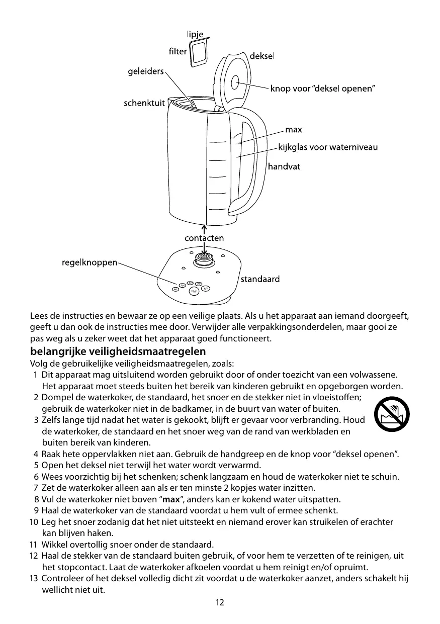 2 N'immergez pas la bouilloire, son socle, le câble ou la prise; n'utilisez pas la bouilloire dans une salle de bains, à proximité d'eau ou à l'extérieur. KR) 3 Le risque de brülure persiste longtemps après ébullition. Tenez la bouilloire, le socle W—S et le câble loin des bords des surfaces de travail et hors de portée des enfants. 4 Ne touchez pas les surfaces chaudes. Utilisez la poignée et le bouton de dégagement du couvercle. 5 Ne soulevez pas le couvercle pendant que l'eau chauffe. 6 Faites attention en versant - versez lentement, et n'inclinez pas trop la bouilloire 7 N'allumez pas si la bouilloire contient moins de deux tasses d'eau. 8 Ne remplissez pas au-delà de la marque maximum (max), car elle pourrait gicler de l'eau bouillante. 9 Enlevez la bouilloire de son socle avant de la remplir ou de verser. 10 Veillez à ce que le cordon d'alimentation ne soit pas en surplomb et qu'on ne puisse pas trébucher dessus ou l’accrocher. 11 Enroulez le surplus de câble sous le socle. 12 Débranchez le socle quand il n’est pas utilisé, avant de le bouger ou de le nettoyer. Laissez la bouilloire refroidir avant de la nettoyer et de la ranger. 13 Vérifiez que le couvercle est correctement fermé avant d'allumer la bouilloire, car sinon elle pourrait ne pas s'éteindre.