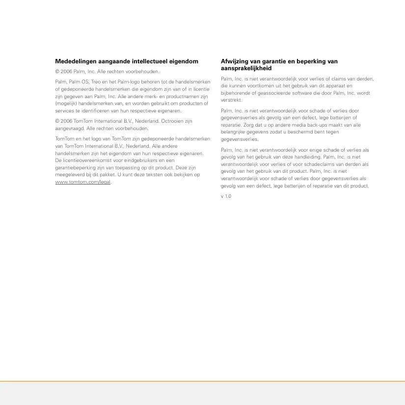 Mededelingen aangaande intellectueel eigendom © 2006 Palm, Inc. Alle rechten voorbehouden. Palm, Palm OS, Treo en het Palm-logo behoren tot de handelsmerken of gedeponeerde handelsmerken die eigendom zijn van of in licentie zijn gegeven aan Palm, Inc. Alle andere merk- en productnamen zijn (mogelijk) handelsmerken van, en worden gebruikt om producten of services te identificeren van hun respectieve eigenaren. © 2006 TomTom International B.V., Nederland. Octrooien zijn aangevraagd. Alle rechten voorbehouden. TomTom en het logo van TomTom zijn gedeponeerde handelsmerken van TomTom International B.V., Nederland. Alle andere handelsmerken zijn het eigendom van hun respectieve eigenaren. De licentieovereenkomst voor eindgebruikers en een garantiebeperking zijn van toepassing op dit product. Deze zijn meegeleverd bij dit pakket. U kunt deze teksten ook bekijken op www.tomtom.com/legal. Afwijzing van garantie en beperking van aansprakelijkheid Palm, Inc. is niet verantwoordelijk voor verlies of claims van derden, die kunnen voortkomen uit het gebruik van dit apparaat en bijbehorende of geassocieerde software die door Palm, Inc. wordt verstrekt. Palm, Inc. is niet verantwoordelijk voor schade of verlies door gegevensverlies als gevolg van een defect, lege batterijen of reparatie. Zorg dat u op andere media back-ups maakt van alle belangrijke gegevens zodat u beschermd bent tegen gegevensverlies. Palm, Inc. is niet verantwoordelijk voor enige schade of verlies als gevolg van het gebruik van deze handleiding. Palm, Inc. is niet verantwoordelijk voor verlies of voor schadeclaims van derden als gevolg van het gebruik van dit product. Palm, Inc. is niet verantwoordelijk voor schade of verlies door gegevensverlies als gevolg van een defect, lege batterijen of reparatie van dit product. v 1.0 Aan de slag De Palm® GPS Navigator-carkit is een GPSnavigatiesysteem dat uit de volgende onderdelen bestaat: