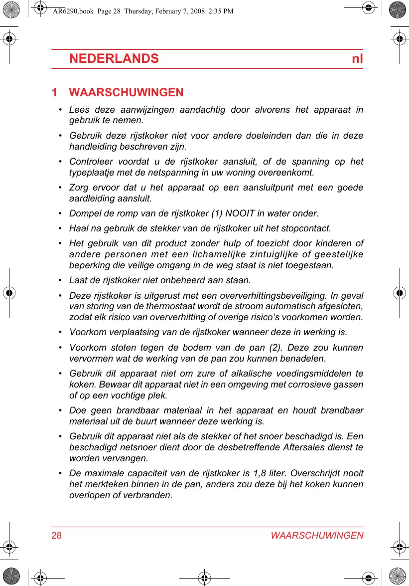- De maximale capaciteit van de rijstkoker is 1,8 liter. Overschrijdt nooit het merkteken binnen in de pan, anders zou deze bij het koken können overlopen of verbranden.