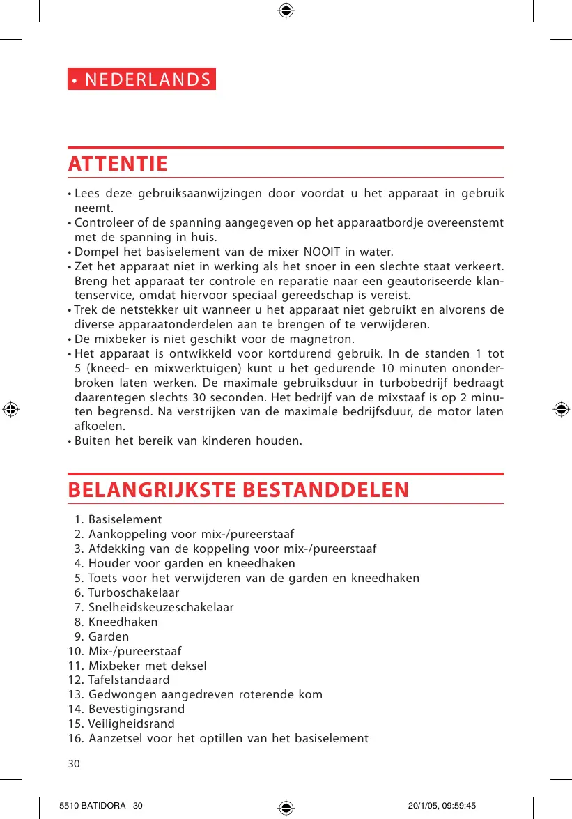 NEDERLAN ATTENTIE + Lees deze gebruiksaanwijzingen door voordat u het apparaat in gebruik neemt. + Controleer of de spanning aangegeven op het apparaatbordje overeenstemt met de spanning in huis. + Dompel het basiselement van de mixer NOOIT in water. + Zet het apparaat niet in werking als het snoer in een slechte staat verkeert. Breng het apparaat ter controle en reparatie naar een geautoriseerde klan- tenservice, omdat hiervoor speciaal gereedschap is vereist. + Trek de netstekker uit wanneer u het apparaat niet gebruikt en alvorens de diverse apparaatonderdelen aan te brengen of te verwijderen. + De mixbeker is niet geschikt voor de magnetron. + Het apparaat is ontwikkeld voor kortdurend gebruik. In de standen 1 tot 5 (kneed- en mixwerktuigen) kunt u het gedurende 10 minuten ononder- broken laten werken. De maximale gebruiksduur in turbobedrijf bedraagt daarentegen slechts 30 seconden. Het bedrijf van de mixstaaf is op 2 minu- ten begrensd. Na verstrijken van de maximale bedrijfsduur, de motor laten afkoelen. - Buiten het bereik van kinderen houden. BELANGRIJKSTE BESTANDDELEN