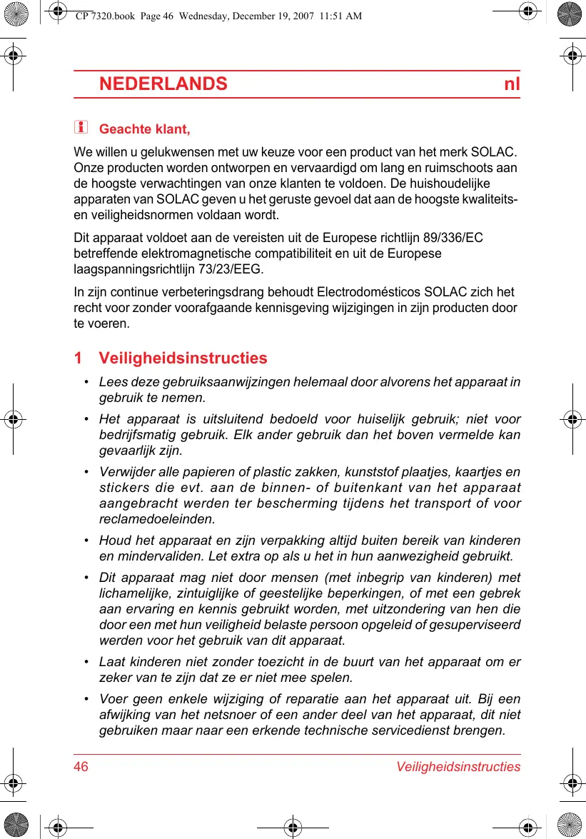 We willen u gelukwensen met uw keuze voor een product van het merk SOLAC. Onze producten worden ontworpen en vervaardigd om lang en ruimschoots aan de hoogste verwachtingen van onder klanten te voldoen. De huishoudelijkke apparaten van SOLAC gezven u het geruste gevoel dat aan de hoogste kwaliteitsen veiligheidsnormen voldaan worden.