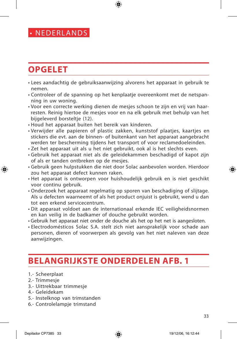 Download de handleiding voor uw Elektrisch scheerapparaat in PDF-formaat gratis! Vind uw handleiding CP7385 - SOLAC en neem uw elektronisch apparaat weer in handen. Op deze pagina staan alle documenten die nodig zijn voor het gebruik van uw apparaat. CP7385 van het merk SOLAC.