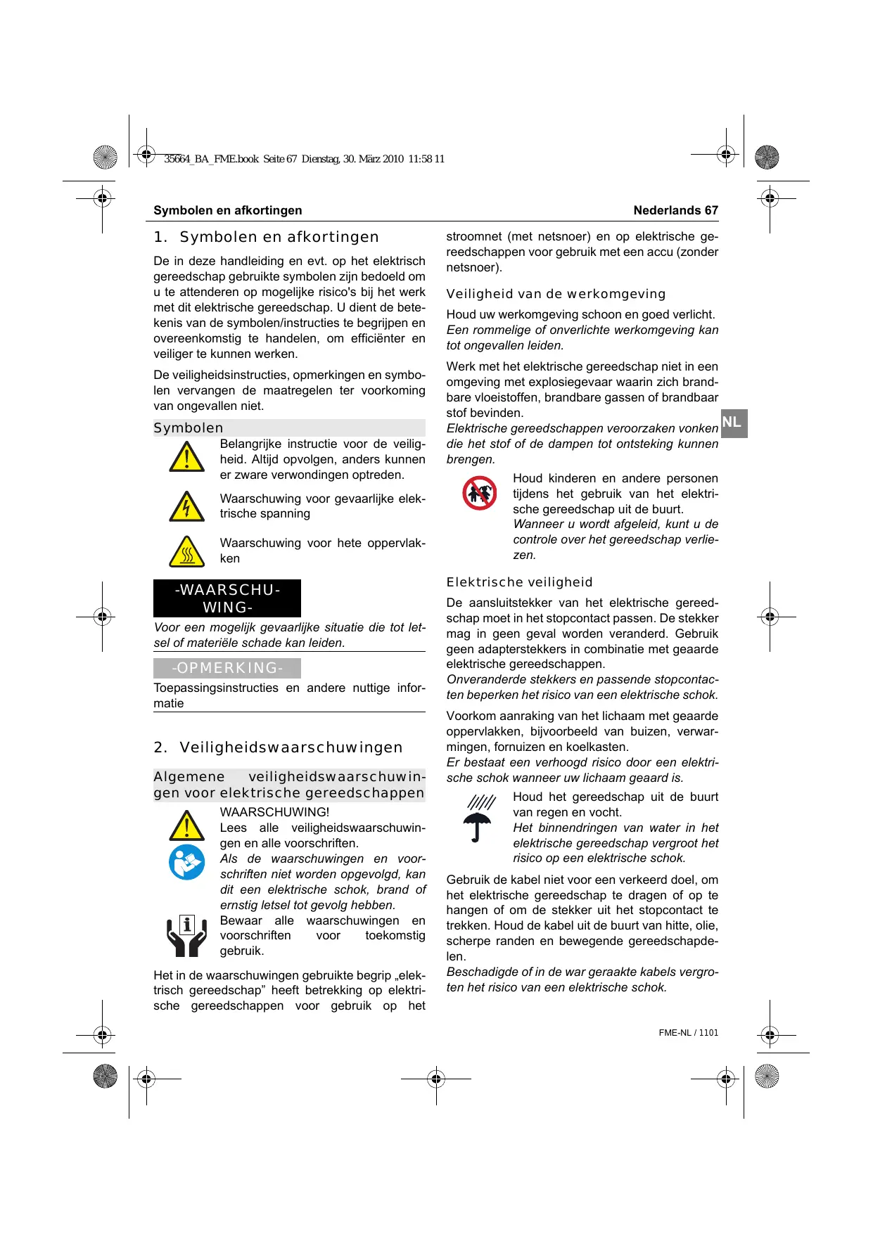 Trek voor alle werkzaamheden aan het elektrisch gereedschap eerst het snoer uit het stopcontact. Ingebruikname Let op de netspanning! Controleer voor inbedrijfstelling of de op het typeplaatje aangegeven netspanning en netfrequentie overeenkomen met de gegevens van uw stroomnet. Evt. netsnoermodule aansluiten Netsnoer Als het snoer tijdens de werkzaamheden beschadigd raakt, onmiddellijk de stekker uit het stopcontact trekken. FME-NL / 1101 35664_BA_FME.book Seite 72 Dienstag, 30. März 2010 11:58 11 72 Nederlands Langzame start Netsnoer Netsnoer Een beschadigd netsnoer mag niet meer worden gebruikt. Het snoer dient onmiddellijk door een vakman te worden vervangen. Netsnoermodule Netsnoermodule met patent snelsluiting.