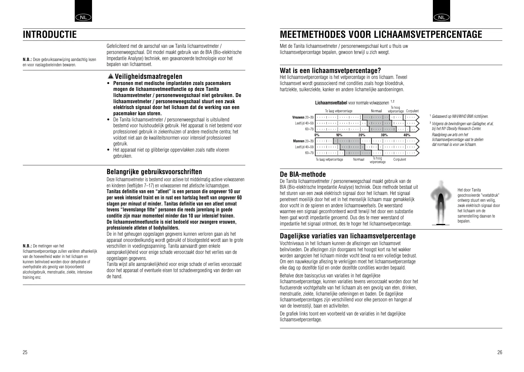 N.B.: Deze gebruikszanwijing zandachtig lezen en voor naslagdoeleinden bevaren. Gefeliciteerd met de aanschaf van uw Tanita lichaamsvetmeter / personenweegschaal. Dit model maakt gebruik van de BIA (Bio-elektrische Impedantie Analyse) techniek, een geavanceerde technologie voor het bepalen van lichaamsvet. À Veiligheidsmaatregelen Personen met medische implantaten zoals pacemakers mogen de lichaamsvetmeetfunctie op deze Tanita lichaamsvetmeter / personenweegschaal niet gebruiken. De lichaamsvetmeter / personenweegschaal stuurt een zwak elektrisch signaal door het lichaam dat de werking van een pacemaker kan storen. De Tanita lichaamsvetmeter / personenweegschaal is uitsluitend bestemd voor huishoudelijk gebruik. Het apparaat is niet bestemd voor professionel gebruik in ziekenhuizen of andere medische centra; het voldoet niet aan de kwaliteitsnormen voor intensief professioneel gebruik. Het apparaat niet op glibberige opperviakken zoals natte vioeren gebruiken. N.B.: De meïingen van het lichaamsvetpercentage zullen variéren afhankelijk van de hoeveelheid water in het lichaarm en kunnen béinvloed worden door dehydrate of overhydrale als gevolg van bijvoorbeeld alcoholgebruik, menstruaie, ziekt, intensieve training enz. Belangrijke gebruiksvoorschriften Deze lichaamsvetmeter is bestemd voor actieve tot middelmatig actieve volwassenen en kinderen (leeftijden 7-17) en volwassenen met atletische lichaamstypen. Tanitas definitie van een “atleet” is een persoon die ongeveer 10 uur per week intensief traint en in rust een hartslag heeft van ongeveer 60 slagen per minuut of minder. Tanitas definitie van een atleet omvat tevens “levenslange fitte” personen die reeds jarenlang in goede conditie zijn maar momenteel minder dan 10 uur intensief trainen. De lichaamsvetmeetfunctie is niet bedoeld voor zwangere vrouwen, professionele atleten of bodybuilders. De in het geheugen opgeslagen gegevens kunnen verloren gaan als het apparaat onoordeelkundig wordt gebruikt of blootgesteld wordt aan te grote verschillen in voedingsspanning. Tanita aanvaardt geen enkele aansprakelijkheid voor enige schade veroorzaakt door het verlies van de opgeslagen gegevens. Tanita wijst alle aansprakelijkheid voor enige schade of verlies veroorzaakt door het apparaat of eventuele eisen tot schadevergoeding van derden van de hand.