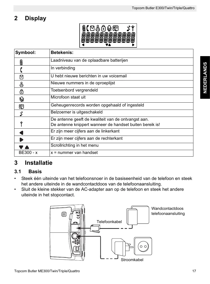 Volume van beltoon van handset te laag (indiquée dans le compartiment à piles du combiné). Ne touchez pas les contacts du chargeur et de la fiche avec des objets pointus ou métalliques. Certains appareils médicaux pourraient ne plus bien fonctionner. Le combiné peut provoquer un bourdonnement désagréable dans les prothèses auditives. N'installez pas l'appareil de base dans une pièce humide ni à moins de 1,5 m d'un point d'eau. Veillez à ce que le combiné reste sec. N'utilisez pas le téléphone dans un environnement exposé à des risques d'explosion. Eliminez les piles et entretenez le téléphone en respectant l'environnement. Comme ce téléphone est indisponible en cas de coupure de courant, vous devez utiliser un téléphone autonome pour les appels urgents, un téléphone mobile par exemple. Ce téléphone utilise des piles rechargeables. Éliminez les piles de manière écologique, selon les réglementations locales en vigueur.