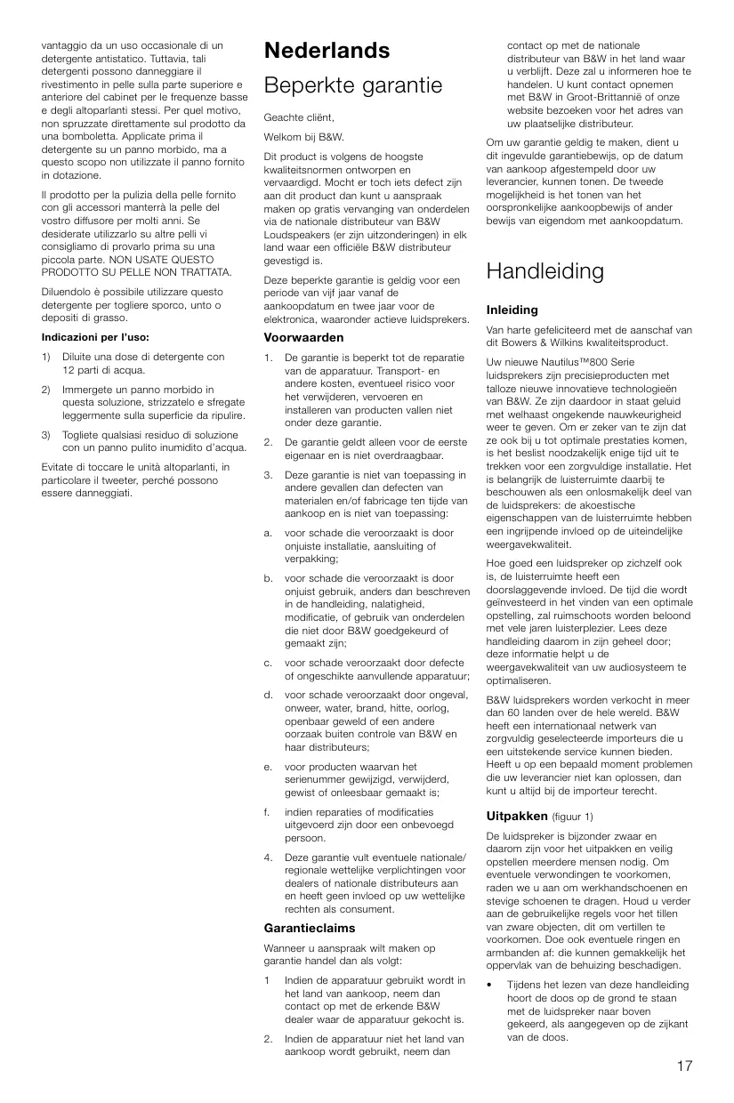 Deze garantie vult eventuele nationale/ regionale wettelijke verplichtingen voor dealers of nationale distributeurs aan en heeft geen invloed op uw wettelijke rechten als consument. Evitate di toccare le unità altoparlanti, in particolare il tweeter, perché possono essere danneggiati. contact op met de nationale distributeur van B&W in het land waar u verblijft. Deze zal u informeren hoe te handelen. U kunt contact opnemen met B&W in Groot-Brittannië of onze website bezoeken voor het adres van uw plaatselijke distributeur. Om uw garantie geldig te maken, dient u dit ingevulde garantiebewijs, op de datum van aankoop afgestempeld door uw leverancier, kunnen tonen. De tweede mogelijkheid is het tonen van het oorspronkelijke aankoopbewijs of ander bewijs van eigendom met aankoopdatum. Handleiding Inleiding Van harte gefeliciteerd met de aanschaf van dit Bowers & Wilkins kwaliteitsproduct. Uw nieuwe Nautilus™800 Serie luidsprekers zijn precisieproducten met talloze nieuwe innovatieve technologieën van B&W. Ze zijn daardoor in staat geluid met welhaast ongekende nauwkeurigheid weer te geven. Om er zeker van te zijn dat ze ook bij u tot optimale prestaties komen, is het beslist noodzakelijk enige tijd uit te trekken voor een zorgvuldige installatie. Het is belangrijk de luisterruimte daarbij te beschouwen als een onlosmakelijk deel van de luidsprekers: de akoestische eigenschappen van de luisterruimte hebben een ingrijpende invloed op de uiteindelijke weergavekwaliteit. Hoe goed een luidspreker op zichzelf ook is, de luisterruimte heeft een doorslaggevende invloed. De tijd die wordt geïnvesteerd in het vinden van een optimale opstelling, zal ruimschoots worden beloond met vele jaren luisterplezier. Lees deze handleiding daarom in zijn geheel door; deze informatie helpt u de weergavekwaliteit van uw audiosysteem te optimaliseren. B&W luidsprekers worden verkocht in meer dan 60 landen over de hele wereld. B&W heeft een internationaal netwerk van zorgvuldig geselecteerde importeurs die u een uitstekende service kunnen bieden. Heeft u op een bepaald moment problemen die uw leverancier niet kan oplossen, dan kunt u altijd bij de importeur terecht. Uitpakken (figuur 1) Wanneer u aanspraak wilt maken op garantie handel dan als volgt: De luidspreker is bijzonder zwaar en daarom zijn voor het uitpakken en veilig opstellen meerdere mensen nodig. Om eventuele verwondingen te voorkomen, raden we u aan om werkhandschoenen en stevige schoenen te dragen. Houd u verder aan de gebruikelijke regels voor het tillen van zware objecten, dit om vertillen te voorkomen. Doe ook eventuele ringen en armbanden af: die kunnen gemakkelijk het oppervlak van de behuizing beschadigen.