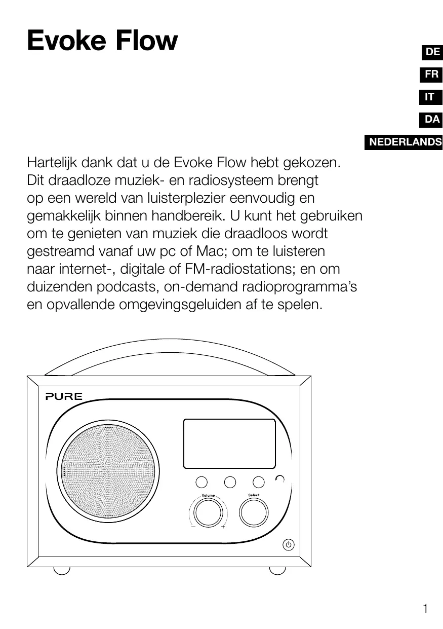 Evoke Flow Es LFR [DA Hartelijk dank dat u de Evoke Flow hebt gekozen. Dit draadloze muziek- en radiosysteem brengt op een wereld van luisterplezier eenvoudig en gemakkelijk binnen handbereik. U kunt het gebruiken om te genieten van muziek die draadloos wordt gestreamd vanaf uw pc of Mac; om te luisteren naar internet-, digitale of FM-radiostations; en om duizenden podcasts, on-demand radioprogramma's en opvallende omgevingsgeluiden af te spelen.