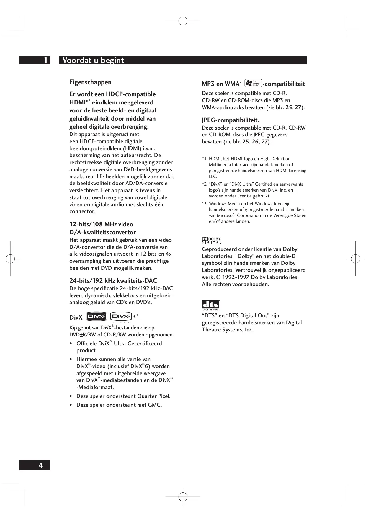 -compatibiliteit JPEG-compatibiliteit. Deze speler is compatible met CD-R, CD-RW en CD-ROM-discs die JPEG-gegevens bevatten (zie blz. 25, 26, 27). *1 HDMI, het HDMI-logo en High-Definition Multimedia Interface zijn handelsmerken of geregistreerde handelsmerken van HDMI Licensing LLC. *2 “DivX”, en “DivX Ultra” Certified en aanverwante logo’s zijn handelsmerken van DivX, Inc. en worden onder licentie gebruikt. *3 Windows Media en het Windows-logo zijn handelsmerken of geregistreerde handelsmerken van Microsoft Corporation in de Verenigde Staten en/of andere landen. Geproduceerd onder licentie van Dolby Laboratories. “Dolby” en het double-D symbool zijn handelsmerken van Dolby Laboratories. Vertrouwelijk ongepubliceerd werk. © 1992-1997 Dolby Laboratories. Alle rechten voorbehouden. “DTS” en “DTS Digital Out” zijn geregistreerde handelsmerken van Digital Theatre Systems, Inc. Voordat u begint