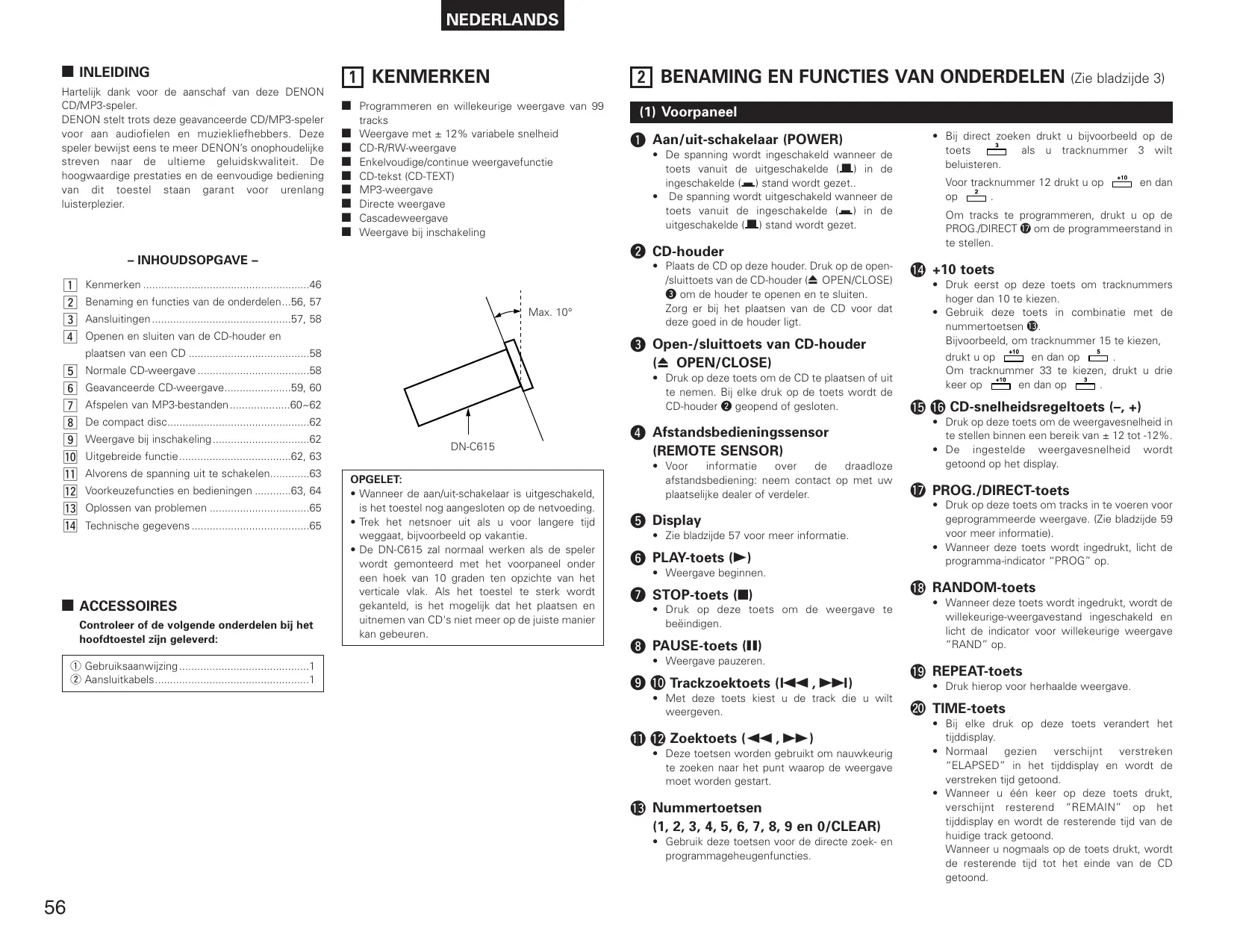 NEDERLANDS 2 INLEIDING Hartelijk dank voor de aanschaf van deze DENON CD/MP3-speler. DENON stelt trots deze geavanceerde CD/MP3-speler voor aan audiofielen en muziekliefhebbers. Deze speler bewijst eens te meer DENON’s onophoudelijke streven naar de ultieme geluidskwaliteit. De hoogwaardige prestaties en de eenvoudige bediening van dit toestel staan garant voor urenlang luisterplezier. 1 KENMERKEN