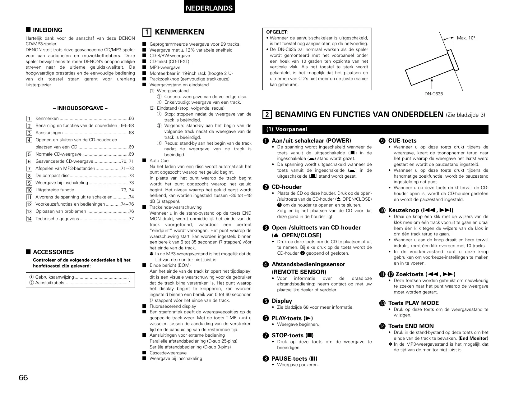 - De DN-C635 zal normaal werken als de speler wordt gemonteerd met het voorpaneel onder een hoek van 10 graden ten opzichte van het verticale vlak. Als het toestel te sterk wordt gekanteld, is het mogelijk dat het plaatsen en uitnemen van CD's niet meer op de juiste manier kan gebeuren. DN-C635