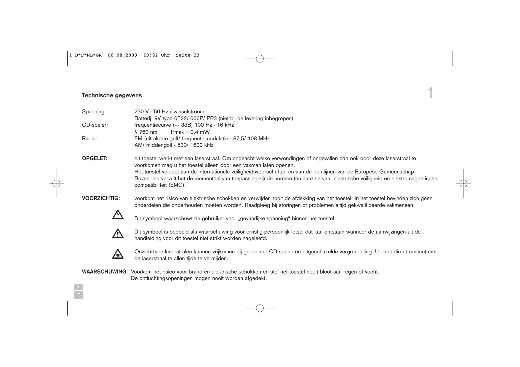 OPGELET: dit toestel werkkt met een laserstraal. Om ongeacht welke verwondingen of ongevalen dan ook door deze laserstraal te voorkomen mag u het toestel alleen door een vakman lately openen.