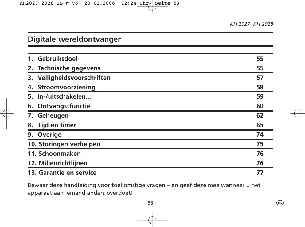 12:24 Uhr Seite 56 KH 2027 KH 2028 c) Overige Geheugenposities: Timer: Deze gegevens beschrijven uitsluitend de technische mogelijkheden van het apparaat! In verschillende landen kunnen afwijkende wettelijke bepalingen van kracht zijn aangaande het vrij te ontvangen frequentie-bereik. Houd er rekening mee dat u buiten het toegewezen frequentiebereik ontvangen informatie niet mag verkopen, doorgeven aan derden of misbruiken voor doeleinden waarvoor de informatie niet bestemd is. Afstembereik: Gevoeligheid: