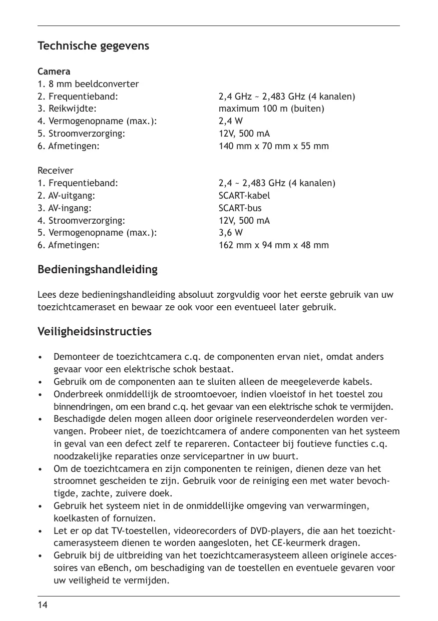 Gebruik bij de uitbreiding van het toezichtcamerasystem een alleen originele accessoires van eBench, om beschadiging van de toestellen en eventuele bevaren voor uw verilgheid te vermijden.