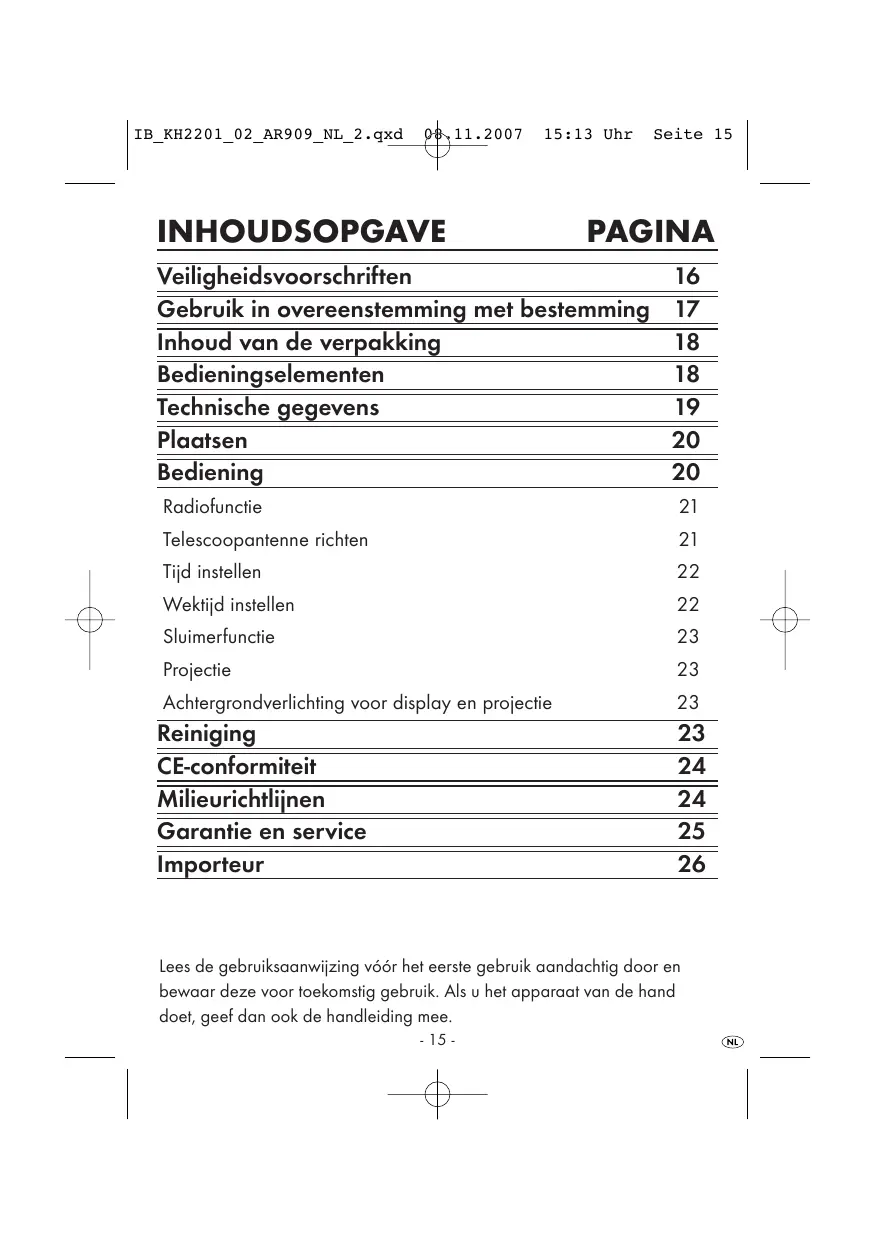 1 Projectieklokk radio, 1 Gebruiksaanwijzing