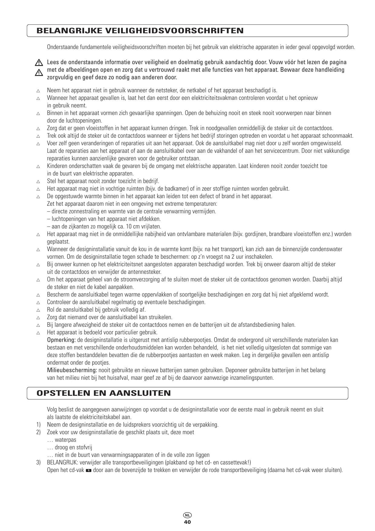Ne pas mettre l'appareil en service si la prise, le cordon ou l'appareil sont endommagés. Si l'appareil est tombé, le faire contrôler au préalable par un électricien spécialisé avant de le remettre en service. L'intérieur de l'appareil est soumis à des tensions dangereuses. Ne jamais ouvrir le boîtier ni introduire des objets par les trous d'aérations. Evitez de faire pénétrer des liquides dans l'appareil. Si nécessaire, débrancher la prise. Débranchez également la prise de la prise murale en cas d'apparition de défauts pendant le fonctionnement de l'appareil et avant de nettoyer l'appareil. Ne procédez vous-même à aucunes modifications ni réparations de l'appareil. De même, ne remplacez pas vous-même le cordon de raccordement. Ne faites procéder à toutes réparations de l'appareil ou du cordon de raccordement que par un atelier spécialisé ou un centre SAV. Toute réparation incorrecte peut être la source de dangers importants pour l'utilisateur. Les enfants sous-estiment souvent les dangers lors de la manipulation d'appareils électriques. Ne laissez donc jamais des enfants à proximité d'appareils électriques sans surveillance. Ne laissez pas l'appareil sans surveillance pendant le fonctionnement. Ne pas utiliser l'appareil dans les lieux humides (par exemple salles de bain) ou soumis à une poussière importante. La chaleur accumulée à l'intérieur de l'appareil peut entraîner une panne ou un incendie. N'exposez donc pas l'appareil à des températures extrêmes: – éviter les rayons directs du soleil et la chaleur du chauffage – ne pas boucher ou recouvrir les fentes d'aération de l'appareil – dans la mesure du possible, laisser 10 cm de libre par rapport aux côtés de l'appareil Ne pas installer l'appareil à proximité immédiate de matériaux inflammables (par exemple rideaux, liquides inflammables etc...). Si la chaîne est transportée d'un lieu froid dans un lieu chaud (par exemple après le transport), il peut se former une condensation à l'intérieur. Pour ne pas endommager la chaîne, attendre au moins 2 heures avant de la mettre en marche. Lors d'un orage, les appareils raccordés au secteur peuvent être endommagés. En cas d'orage, débranchez donc la prise de la prise murale et débranchez également la prise de l'antenne. Pour que l'appareil soit coupé complètement de l'alimentation électrique, il faut absolument débrancher la prise de la prise murale. Ce faisant, saisir la prise et jamais le cordon. Protégez le cordon de raccordement de tout contact avec des surfaces chaudes et de tous autres endommagements et veillez à ne pas le coincer. Contrôlez régulièrement le cordon de raccordement en vue de détecter d'éventuels endommagements. Lors de l'utilisation, déroulez complètement le cordon. Veillez à ce qu'il ne soit pas possible de trébucher sur le cordon de raccordement. En cas d'absence prolongée, débrancher la prise et retirer les piles de la télécommande. L'appareil est conçu pour un usage domestique. Avis: La chaîne est équipée de pieds en caoutchouc antidérapants. Etant donné que les sols peuvent être constitués des matériaux les plus divers et traités avec les produits d'entretien les plus divers, il ne peut être entièrement exclu que certaines de ces substances contiennent des composants susceptibles d'attaquer et de ramollir les pieds en caoutchouc. Le cas échéant, posez un support antidérapant sous les pieds. Protection de l'environnement: Ne jamais mélanger des piles usagées et des piles neuves. Dans l'intérêt de notre environnement, n'éliminez pas les piles usagées dans les ordures ménagères, mais remettez-les à des centres de collecte correspondants.