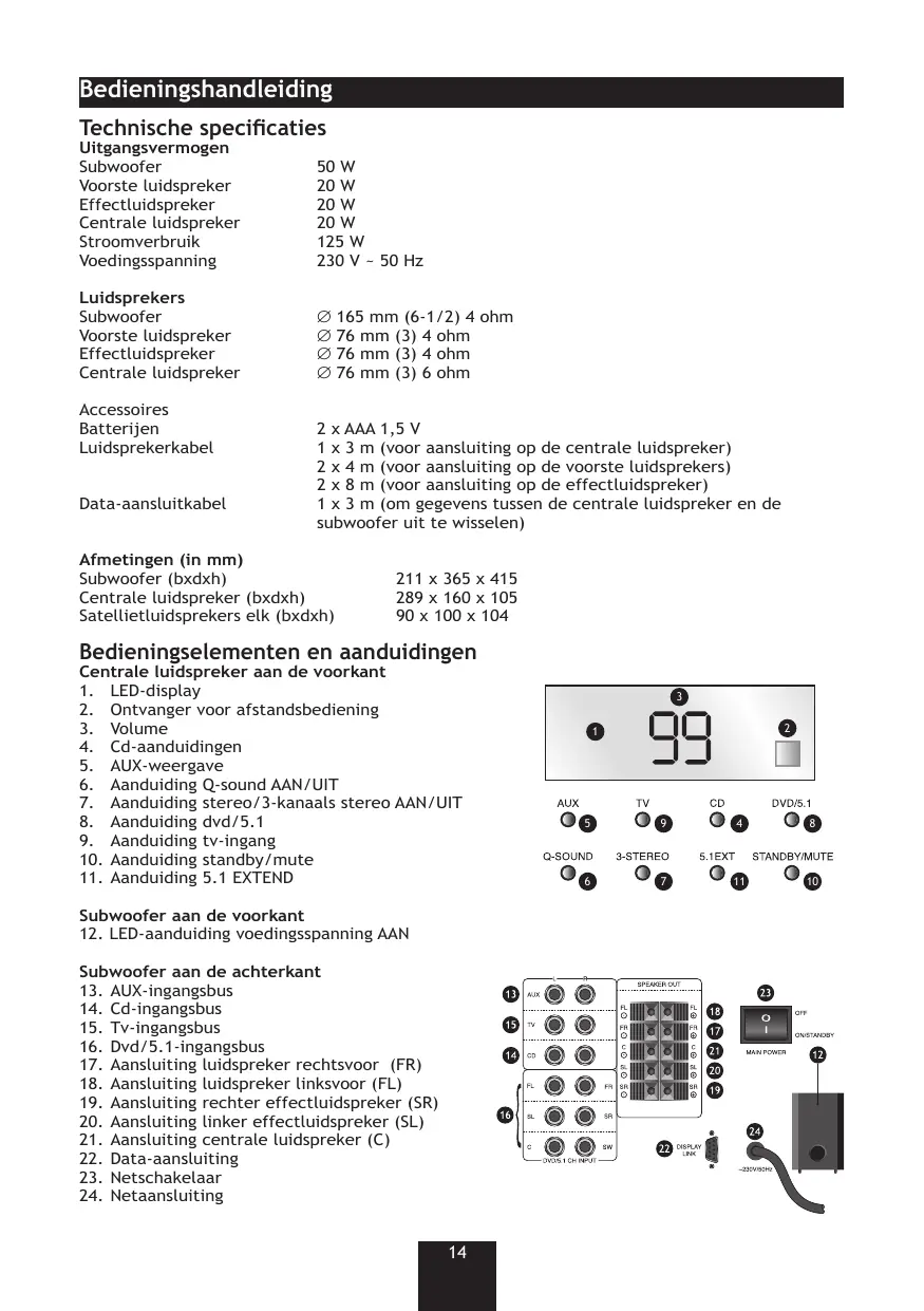 2. Enchez la che secteur du subwoofer dans une prise de courant murale et placez l’interrupteur principal sur ON (marche). La LED POWER ON/STANDBY (secteur marche/état d’attente) sur la face avant du haut-parleur centrale s’allume alors trois fois et reste ensuite allumée. Appuyez sur la touche STANDBY (état d’attente) du haut-parleur central. La LED DVD/5.1 du haut-parleur central s’allume. 3. Sélectionnez l’entrée de signaux correspondante au moyen de la télécommande. DVD/5.1 est sélectionné de manière standard. 4. Réglez le téléviseur sur volume sonore minimal. 5. Mettez la source de signaux souhaitée (lecteur de DVD, magnétoscope, etc…) en circuit. 6. Introduisez le support à reproduire (DVD, cassette vidéo, etc...) et démarrez la lecture. 7. Réglez ensuite le subwoofer, les haut-parleurs avant, les haut-parleurs d’effet et le hautparleur central au moyen de la télécommande de –9 (minimum) jusqu’à 9 (maximum). Le niveau du volume sonore correspondant est afché. 8. Réglez les aiguës et les graves selon vos souhaits de 1-5. 9. Ajustez la balance gauche et droite en appuyant sur les touches correspondantes de 00-15 si nécessaire. L’afchage LED indique 00 lorsque la balance est réglée exactement au milieu. 10. Appuyez sur RESET pour remettre le Surround Sound System aux réglages départ usine (volume sonore principal modéré, graves et aiguës). 11. Après avoir sélectionné les sources pour le signal audio TV/CD/AUX et démarré la reproduction, vous pouvez d’abord entendre un effet sonore surround simulé en appuyant sur la touche 5.1 EXTEND/Q-Sound. En actionnant la touche Stéréo/3 canaux stéréo, vous obtenez l’effet sonore 3 canaux stéréo. Pour retourner au mode stéréo normal, appuyez sur la touche Stéréo/3 canaux stéréo jusqu’à ce que l’indicateur s’éteigne. Remarque : les fonctions Q-SOUND et 3 canaux stéréo ne sont pas activées lorsque 5.1 EXTEND n’est pas encore sur ON (marche). 12. Appuyez sur MUTE (arrêt du son) lorsque vous désirez arrêter le son. L’indicateur STANDBY/ MUTE passe au rouge. Appuyez une deuxième fois sur la touche pour retourner au mode normal.