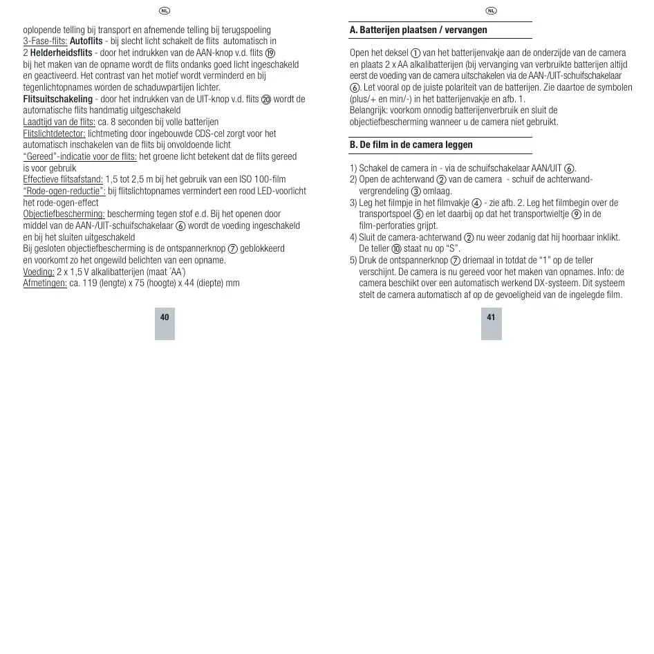 Schakel alsstig de voeding (AAN-/UIT-schuifschakelaar 6)uit, wanneer u de camera Niet gebruikt. Zo spaart u de batterijen en beschermt u het objektief gegen vuil. Verwijder de batterijen wanneer u de camera gedurende langere tijt nied zult gebruiken.