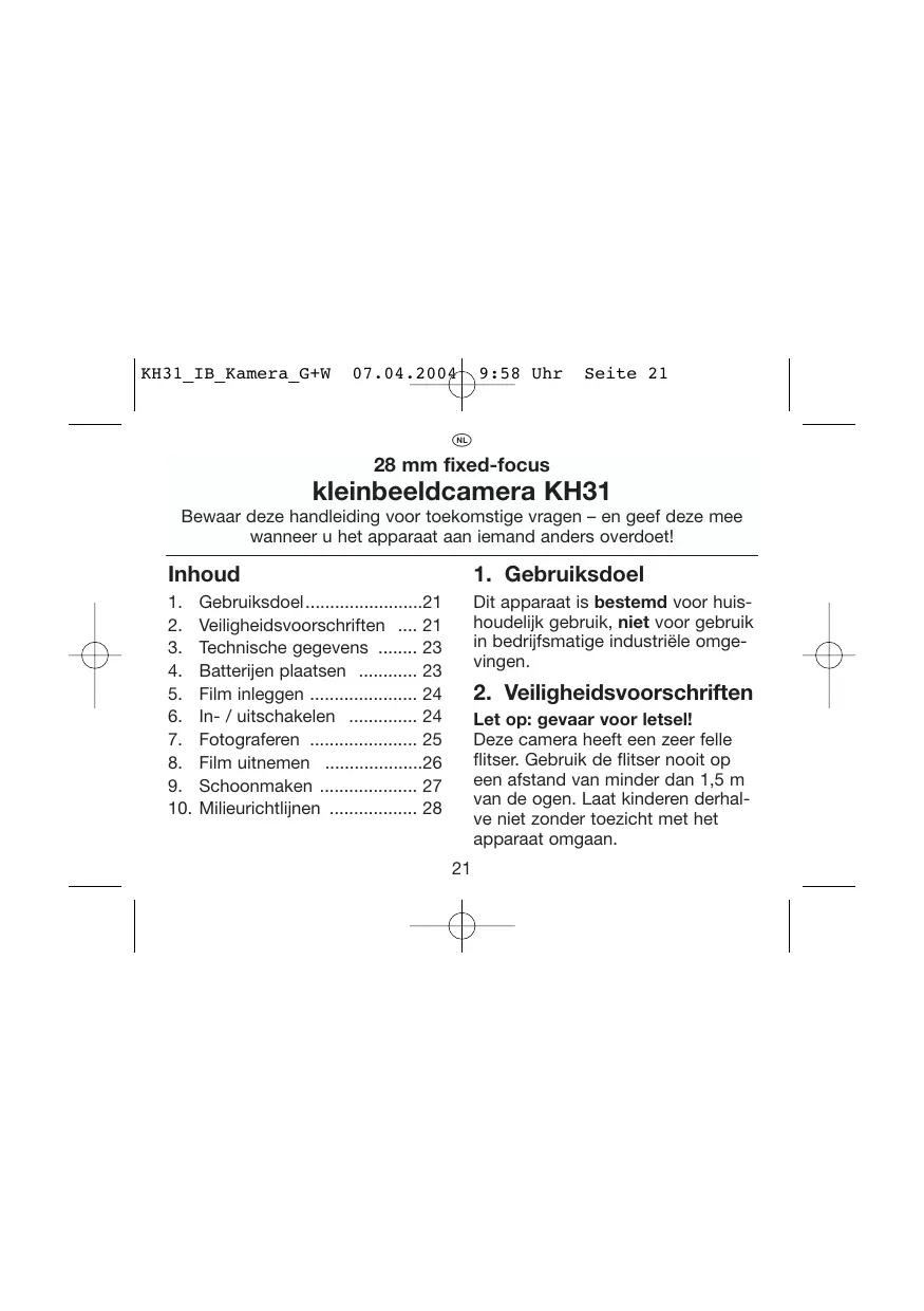 28 mm fixed-focus kleinbeeldcamera KH31 Bewaar deze handleiding voor toekomstige vragen – en geef deze mee wanneer u het apparaat aan iemand anders overdoet! Inhoud