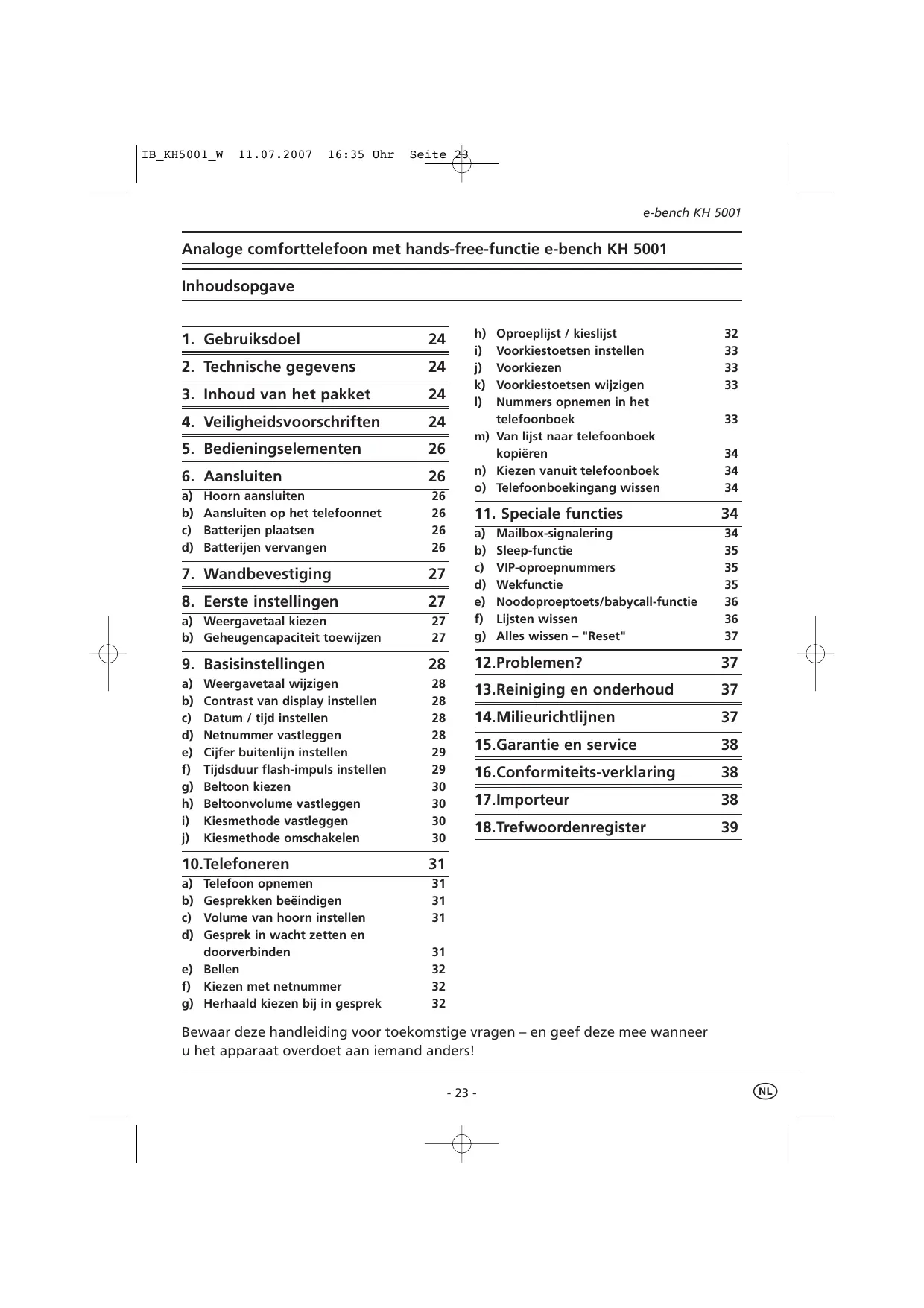 GEBRUIKSAANWIJZING KH 5001 ANALOGUE COMFORT TELEPHONE EBENCH