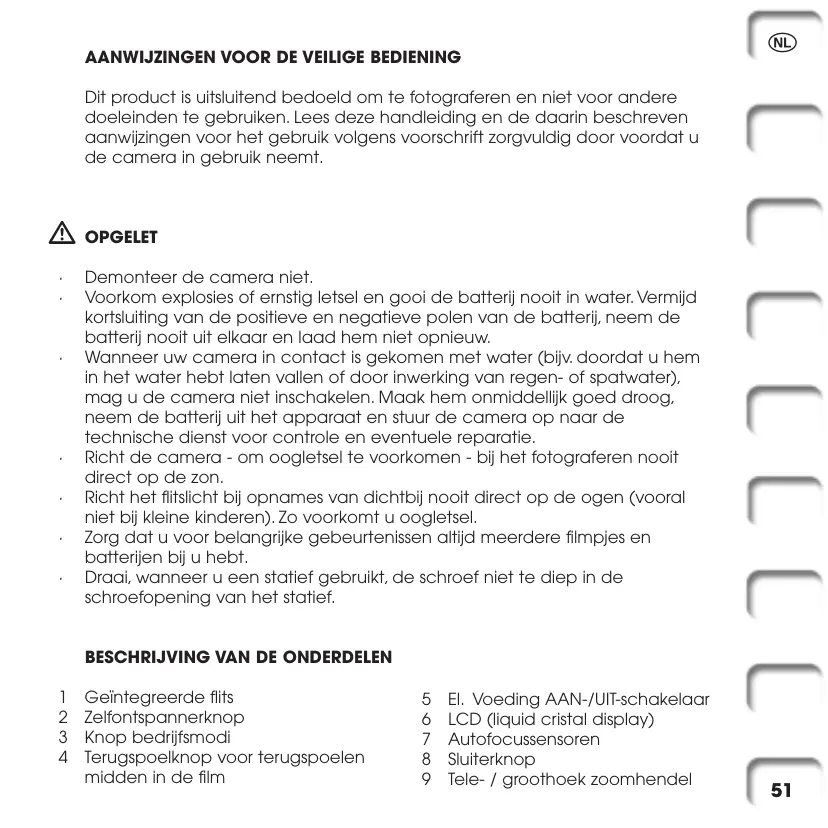 - De camera is een precisie-instrument. Zorg dus dat hij nicht valt, nicht gegood wordt en tegen stoten en druk beschermd worden.