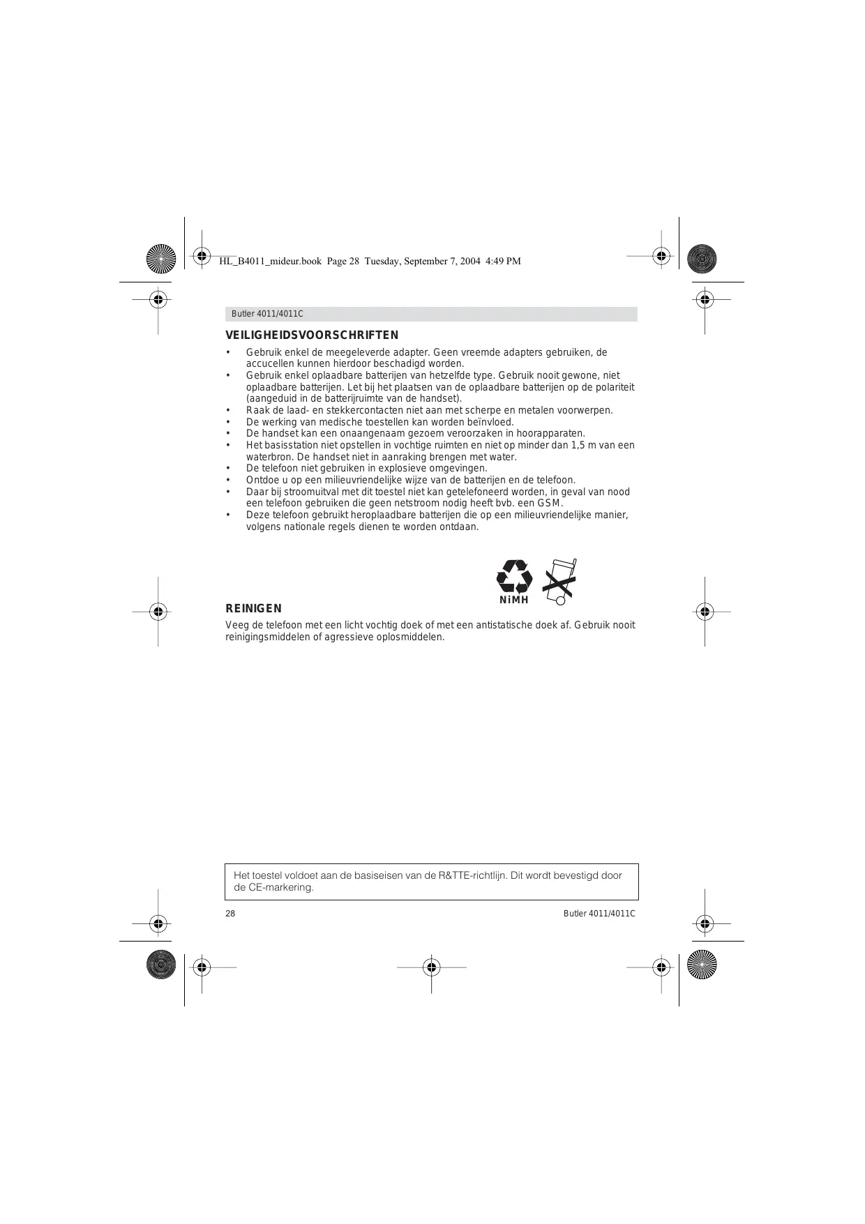 REINIGEN N iMH Veeg de telefoon met een licht vochtig doek of met een antistatische doek af. Gebruik nooit reinigingsmiddelen of agressieve oplosmiddelen. Het toestel voldoet aan de basiseisen van de R&TTE-richtlijn. Dit wordt bevestigd door de CE-markering.
