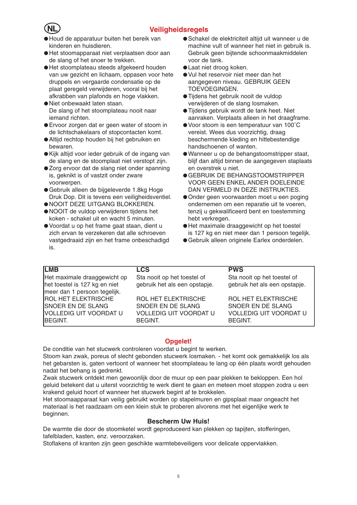 DAN VERMELD IN DEZE INSTRUKTIES. l Onder geen voorwaarden moet u een poging ondernemen om een reparatie uit te voeren, tenzij u gekwalificeerd bent en toestemming hebt verkregen. l Het maximale draaggewicht op het toestel is 127 kg en niet meer dan 1 persoon tegelijk. l Gebruik alleen originele Earlex onderdelen. LMB LCS PWS Het maximale draaggewicht op het toestel is 127 kg en niet meer dan 1 persoon tegelijk.