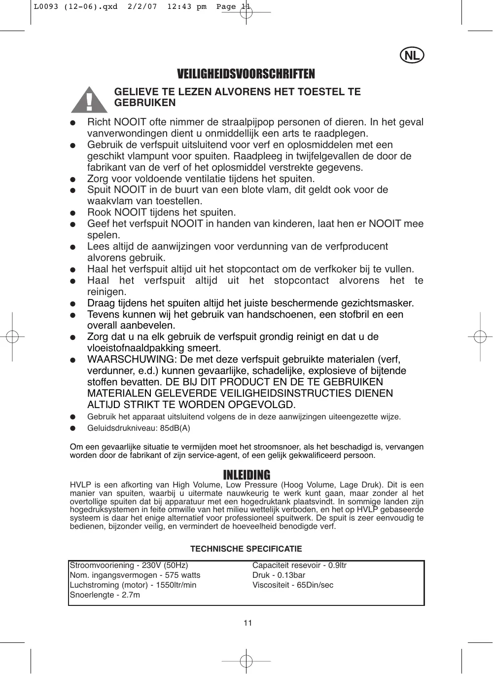 ALTIJD STRIKT TE WORDEN OPGEVOLGD. Gebruik het apparaat uitsluitend volgens de in deze aanwijzingen uiteengezette wijze. Geluidsdrukniveau: 85dB(A) Om een gevaarlijke situatie te vermijden moet het stroomsnoer, als het beschadigd is, vervangen worden door de fabrikant of zijn service-agent, of een gelijk gekwalificeerd persoon. INLEIDING HVLP is een afkorting van High Volume, Low Pressure (Hoog Volume, Lage Druk). Dit is een manier van spuiten, waarbij u uitermate nauwkeurig te werk kunt gaan, maar zonder al het overtollige spuiten dat bij apparatuur met een hogedruktank plaatsvindt. In sommige landen zijn hogedruksystemen in feite omwille van het milieu wettelijk verboden, en het op HVLP gebaseerde systeem is daar het enige alternatief voor professioneel spuitwerk. De spuit is zeer eenvoudig te bedienen, bijzonder veilig, en vermindert de hoeveelheid benodigde verf. TECHNISCHE SPECIFICATIE Stroomvooriening - 230V (50Hz) Nom. ingangsvermogen - 575 watts Luchstroming (motor) - 1550ltr/min Snoerlengte - 2.7m Capaciteit resevoir - 0.9ltr Druk - 0.13bar Viscositeit - 65Din/sec