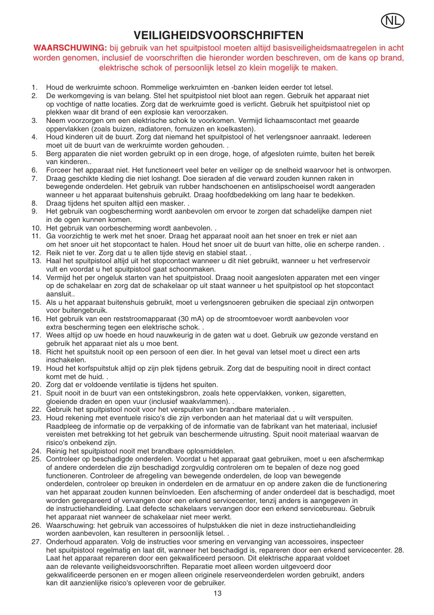 WAARSCHUWING: bij gebruik van het spuitpistol要去en algtd basisveiligheidsmaatregelen in acheit worden genomen, inclusief de voorschriften die hieronder worden beschreven, om de kans op brand, elektrische schok of persoonlijk letsel zo Klein möglich te make.
