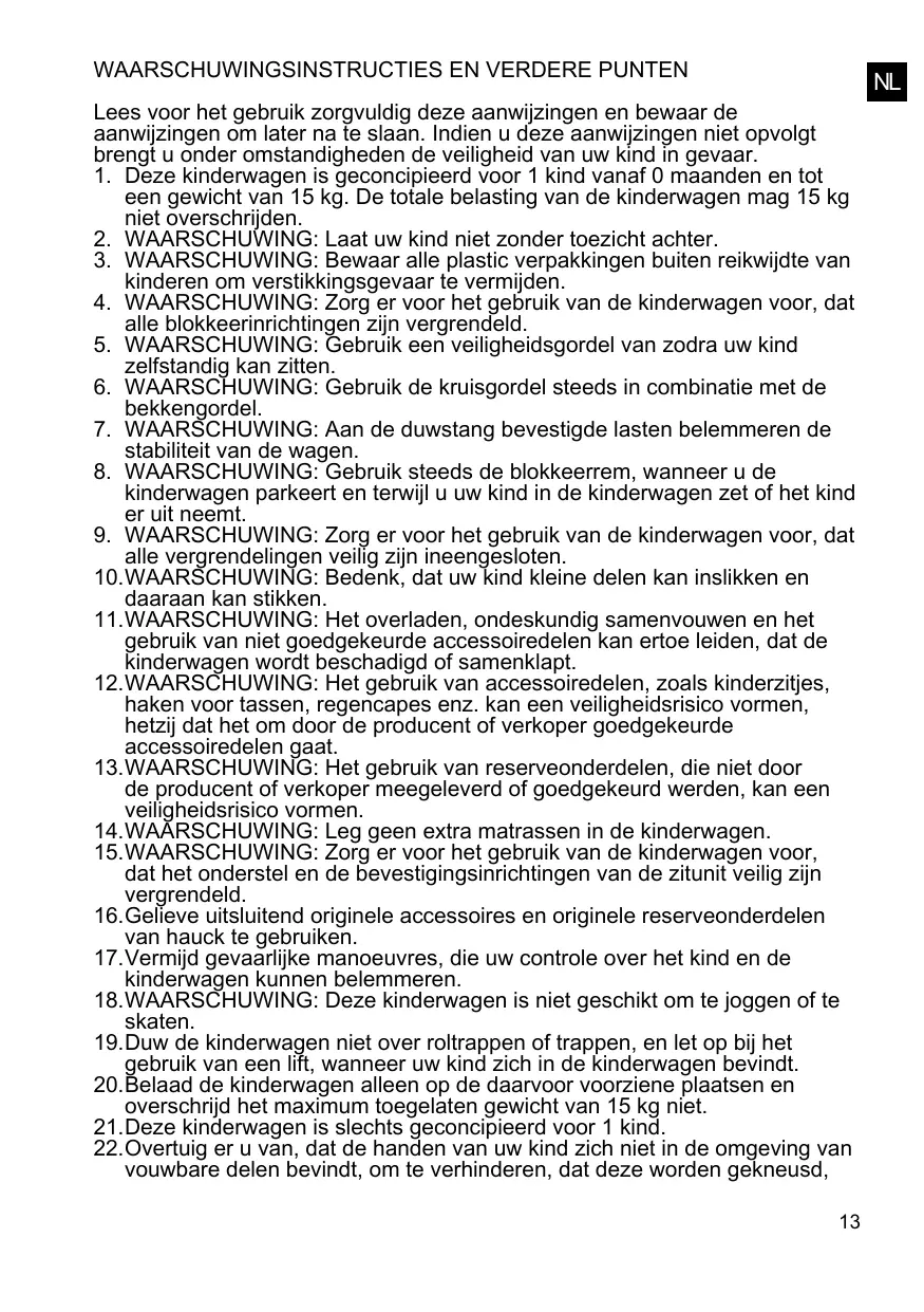 1. Cette poussette est conçue pour un enfant à partir de 0 mois et jusqu‘à un poids de 15 kg. La charge maximale de la poussette ne doit pas dépasser 15 kg. 2. AVERTISSEMENT : Ne laissez jamais votre enfant sans surveillance. 3. AVERTISSEMENT : conservez tous les conditionnements en plastique hors de portée des enfants en prévention de tout danger d‘asphyxie. 4. AVERTISSEMENT : assurez-vous que tous les dispositifs d‘arrêt de la poussette ont été correctement bloqués avant de vous en servir. 5. AVERTISSEMENT : servez-vous d‘un harnais de sécurité dès que votre enfant peut se tenir assis tout seul. 6. AVERTISSEMENT : servez-vous toujours de la ceinture entre les jambes en combinaison avec la ceinture pour la hanche. 7. AVERTISSEMENT : les charges suspendues au guidon ou aux cannes influencent la stabilité de la poussette. 8. AVERTISSEMENT : utilisez toujours le frein d‘arrêt lorsque vous immobilisez la poussette et chaque fois que vous placez l‘enfant dans la poussette ou que vous le retirez. 9. AVERTISSEMENT : assurez-vous que tous les dispositifs d‘arrêt de la poussette ont été correctement enclenchés avant de vous en servir. 10.AVERTISSEMENT : n‘oubliez jamais que votre enfant pourrait avaler les petites pièces et s‘asphyxier. 11.AVERTISSEMENT : les surcharges, un repliage non conforme à l‘usage prévu et l‘emploi d‘accessoires non homologués peuvent endommager la poussette ou provoquer son effondrement. 12.AVERTISSEMENT : l‘emploi d‘accessoires, tels les sièges pour enfant, crochets pour sacs, capots protège-pluie etc. est susceptible de présenter un risque, sauf s‘il s‘agit d‘accessoires homologués par le fabricant ou le distributeur. 13.AVERTISSEMENT : l‘emploi de pièces de rechange non fournies ou homologuées par le fabricant ou le distributeur peut présenter un risque pour la sécurité. 14.AVERTISSEMENT : ne posez jamais de matelas supplémentaires dans la poussette. 15.AVERTISSEMENT : veillez, avant de vous servir de la poussette, à ce que le bâti et les dispositifs de fixation de l‘assise soient correctement enclenchés. 16.Utilisez exclusivement des accessoires d‘origine et des pièces de rechange d‘origine de la maison hauck. 17.Evitez toutes les situations d‘emploi extrêmes, qui risquent de réduire votre contrôle sur l’enfant et la poussette. 18.AVERTISSEMENT : cette poussette n‘est pas appropriée à la pratique du jogging ou de patins en ligne. 19.Ne vous servez pas de la poussette sur des escaliers roulants ou des escaliers en général et soyez prudent dans les ascenseurs tant que votre enfant occupe la poussette. 17