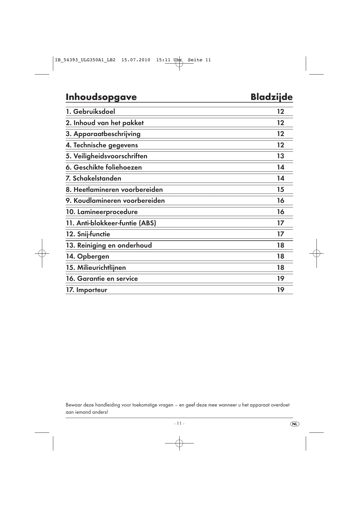 Inhoudsopgave Bladzijde 1. Gebruiksdoel 12 2. Inhoud van het pakket 12 3. Apparaatbeschrijving 12 4. Technische gegevens 12 5. Veiligheidsvoorschriften 13 6. Geschikte foliehoezen 14 7. Schakelstanden 14 8. Heetlamineren voorbereiden 15 9. Koudlamineren voorbereiden 16 10. Lamineerprocedure 16 11. Anti-blokkeer-funtie (ABS) 17 12. Snij-functie 17 13. Reiniging en onderhoud 18 14. Opbergen 18 15. Milieurichilijinen 18 16. Garantie en service 19 17. Importeur 19
