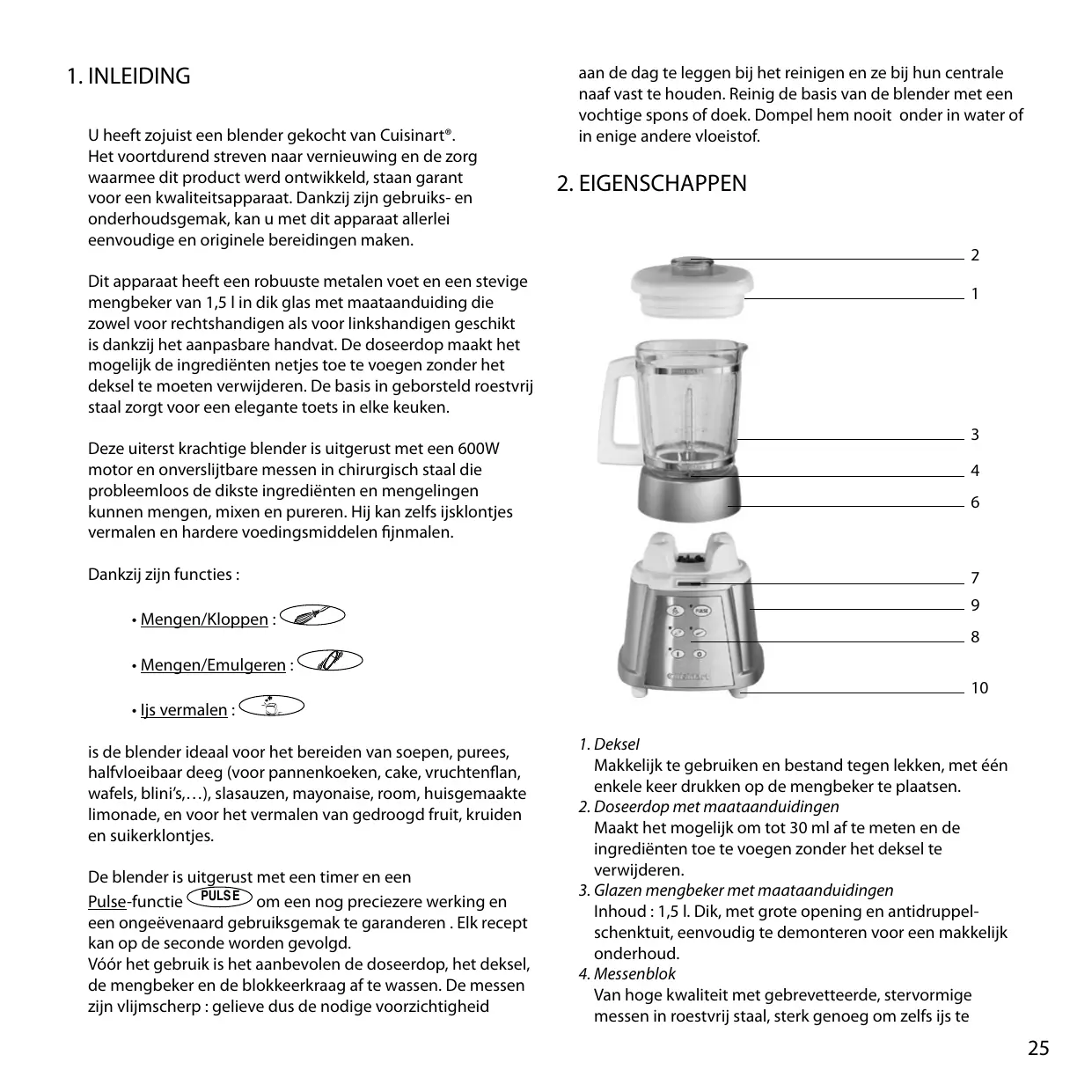 U heeft zojuist een blender gekocht van Cuisinart®. Het voortdurend streven naar vernieuwing en de zorg waarmee dit product werd ontwikkeld, staan garant voor een kwaliteitsapparaat. Dankzij zijn gebruiks- en onderhoudsgemak, kan u met dit apparaat allerlei eenvoudige en originele bereidingen maken. Dit apparaat heeft een robuuste metalen voet en een stevige mengbeker van 1,5 l in dik glas met maataanduiding die zowel voor rechtshandigen als voor linkshandigen geschikt is dankzij het aanpasbare handvat. De doseerdop maakt het mogelijk de ingrediënten netjes toe te voegen zonder het deksel te moeten verwijderen. De basis in geborsteld roestvrij staal zorgt voor een elegante toets in elke keuken. Deze uiterst krachtige blender is uitgerust met een 600W motor en onverslijtbare messen in chirurgisch staal die probleemloos de dikste ingrediënten en mengelingen kunnen mengen, mixen en pureren. Hij kan zelfs ijsklontjes vermalen en hardere voedingsmiddelen fijnmalen. Dankzij zijn functies :