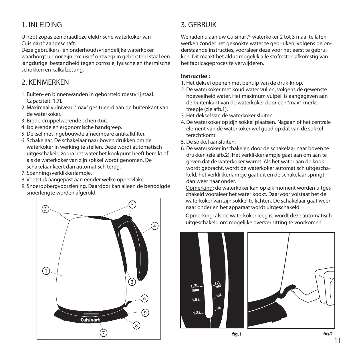 U hebt zopas een draadloze elektrische waterkoker van Cuisinart® aangeschaft. Deze gebruikers- en onderhoudsvriendelijke waterkoker waarborgt u door zijn exclusief ontwerp in geborsteld staal een langdurige bestandheid tegen corrosie, fysische en thermische schokken en kalkafzetting. We raden u aan uw Cuisinart®-waterkoker 2 tot 3 maal te laten werken zonder het gekookte water te gebruiken, volgens de onderstaande instructies, vooraleer deze voor het eerst te gebruiken. Dit maakt het aldus mogelijk alle stofresten afkomstig van het fabricageproces te verwijderen.
