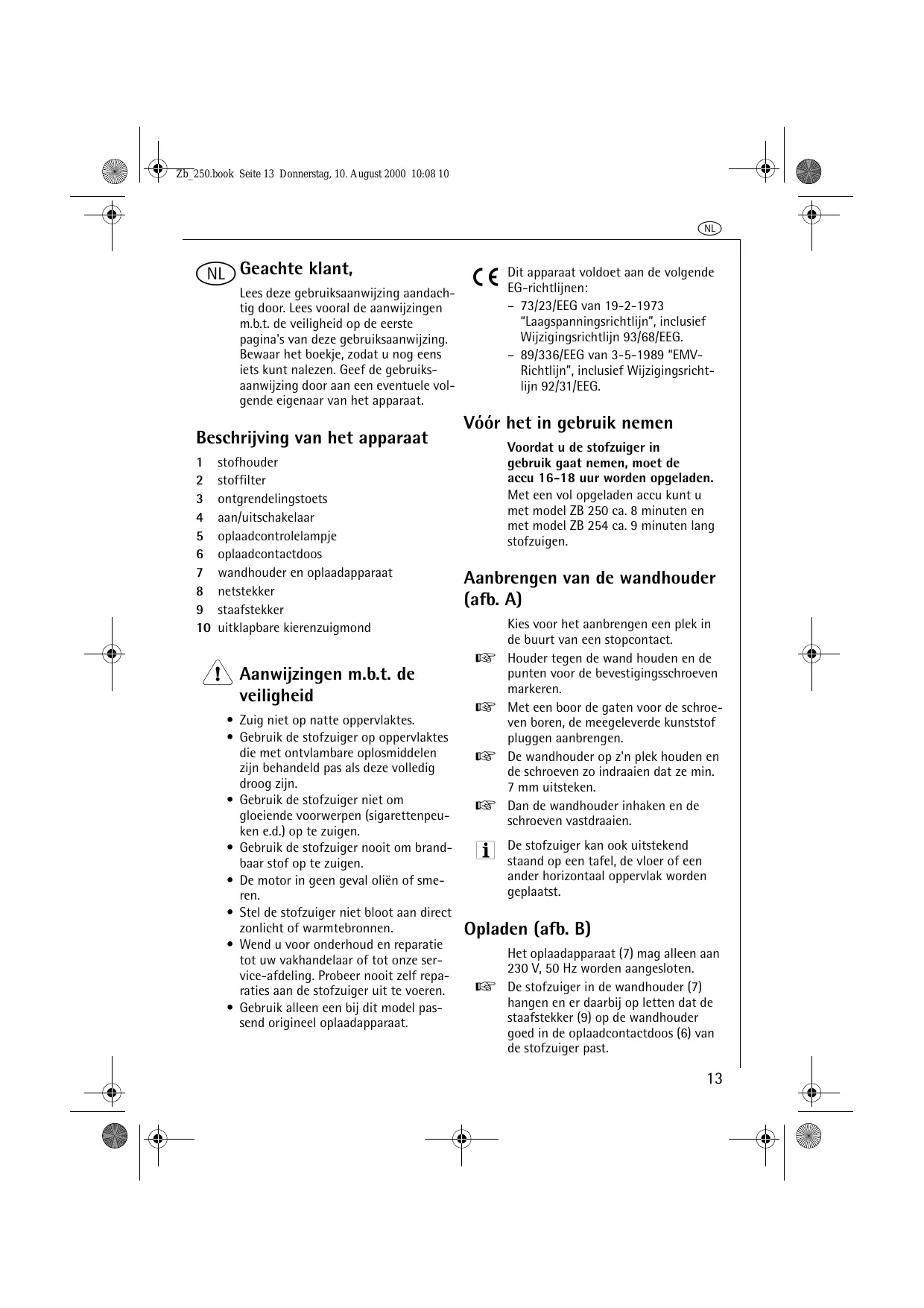 Voordat u de stofzuiger in gebruik gaat nemen, moet de accu 16-18 eer worden opgeladen. Met een vol opgeladen accu sunt u met model ZB 250 ca. 8 minutes en met model ZB 254 ca. 9 minutes lang stofzuigen.