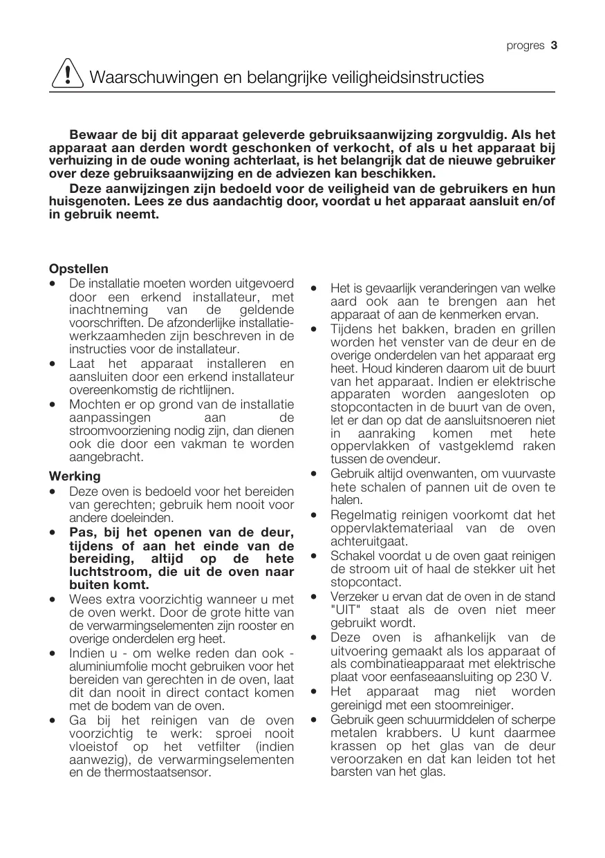 2 progres Inhoud Waarschuwingen en belangrike veiligheidsinstructies SG Beschrijving van het apparaat … 5 Bediening .6 Voor het eerste gebruik ré Elektronisch programmeren ss 8 Bereidingswijzen in de oven Bak-tabellen . Reiniging en onderhoud Storingen - Wat moet u doen? Technische gegevens . Voor de installateur nn Instructies voor de inbouw Klantenservice Handleiding voor de gebruiksaanwijzing  Veiligheidsinstructies Æ Stap-voor-stap-handleiding Dit apparaat voldoet aan de volgende EU-richtlijnen C € 2006/95 (laagspanningsrichtlijn); 89/336 (EMC-richtlijn); - 93/68 (Algemene richtlijn); en de daarop volgende wijzigingen. FABRIKANT: ELECTROLUX HOME PRODUCTS ITALY S.pA. Viale Bologna, 298 47100 FORL] (Italy)
