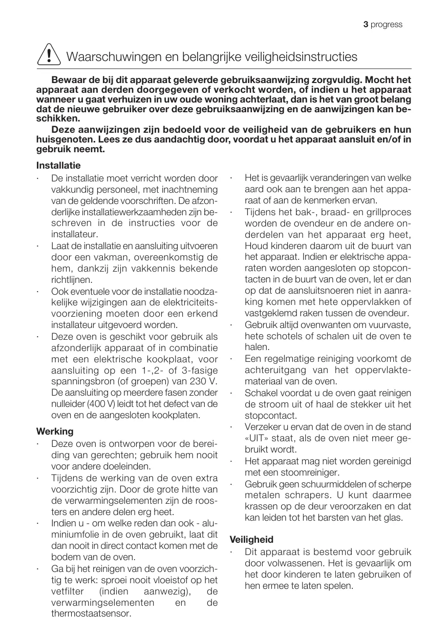 3 progress A Waarschuwingen en belangrike veiligheidsinstructies Bewaar de bij dit apparaat geleverde gebruiksaanwijzing zorgvuldig. Mocht het apparaat aan derden doorgegeven of verkocht worden, of indien u het apparaat wanneer u gaat verhuizen in uw oude woning achterlaat, dan is het van groot belang dat de nieuwe gebruiker over deze gebruiksaanwijzing en de aanwijzingen kan be- schikken. Deze aanwijzingen zijn bedoeld voor de veiligheid van de gebruikers en hun huisgenoten. Lees ze dus aandachtig door, voordat u het apparaat aansluit en/of in gebruik neemt. Installatie De installatie moet verricht worden door vakkundig personeel, met inachtneming van de geldende voorschriften. De afzon- derlike installatiewerkzaamheden zin be- schreven in de instructies voor de installateur. Laat de installatie en aansluiting uitvoeren door een vakman, overeenkomstig de hem, dankzi zijn vakkennis bekende richtlinen. Ook eventuele voor de installatie noodza- kelke wijzigingen aan de elektriciteits- voorziening moeten door een erkend installateur uitgevoerd worden. Deze oven is geschikt voor gebruik als afzonderlik apparaat of in combinatie met een elektrische kookplaat, voor aansluiting op een 1-,2- of 8-fasige spanningsbron (of groepen) van 230 V. De aansluiting op meerdere fasen zonder nulleider (400 V/) leidt tot het defect van de oven en de aangesloten kookplaten. Werking Deze oven is ontworpen voor de berei- ding van gerechten; gebruik hem nooit voor andere doeleinden. Tijdens de werking van de oven extra voorzichtig zijn. Door de grote hitte van de verwarmingselementen zijn de roos- ters en andere delen erg heet. Indien u - om welke reden dan ook - alu- miniumfolie in de oven gebruikt, laat dit dan nooit in direct contact komen met de bodem van de oven. Ga bi het reinigen van de oven voorzich- tig te werk: sproei nooit vloeistof op het vetfilter (indien aanwezig), de verwarmingselementen en de thermostaatsensor. Het is gevaarlijk veranderingen van welke aard ook aan te brengen aan het appa- raat of aan de kenmerken ervan. Tijdens het bak-, braad- en grillproces worden de ovendeur en de andere on- derdelen van het apparaat erg heet, Houd kinderen daarom uit de buurt van het apparaat. Indien er elektrische appa- raten worden aangesloten op stopcon- tacten in de buurt van de oven, let er dan op dat de aansluitsnoeren niet in aanra- king komen met hete opperviakken of vastgeklemd raken tussen de ovendeur. Gebruik altid ovenwanten om vuurvaste, hete schotels of schalen uit de oven te halen. Een regelmatige reiniging voorkomt de achteruitgang van het oppervlakte- material van de oven. Schakel voordat u de oven gaat reinigen de stroom uit of haal de stekker uit het stopcontact. Verzeker u ervan dat de oven in de stand «UIT» staat, als de oven niet meer ge- bruikt wordt. Het apparaat mag niet worden gereinigd met een stoomreiniger. Gebruik geen schuurmiddelen of scherpe metalen schrapers. U kunt daarmee krassen op de deur veroorzaken en dat kan leiden tot het barsten van het glas. Veiligheid Dit apparaat is bestemd voor gebruik door volwassenen. Het is gevaarlijk om het door kinderen te laten gebruiken of hen ermee te laten spelen.