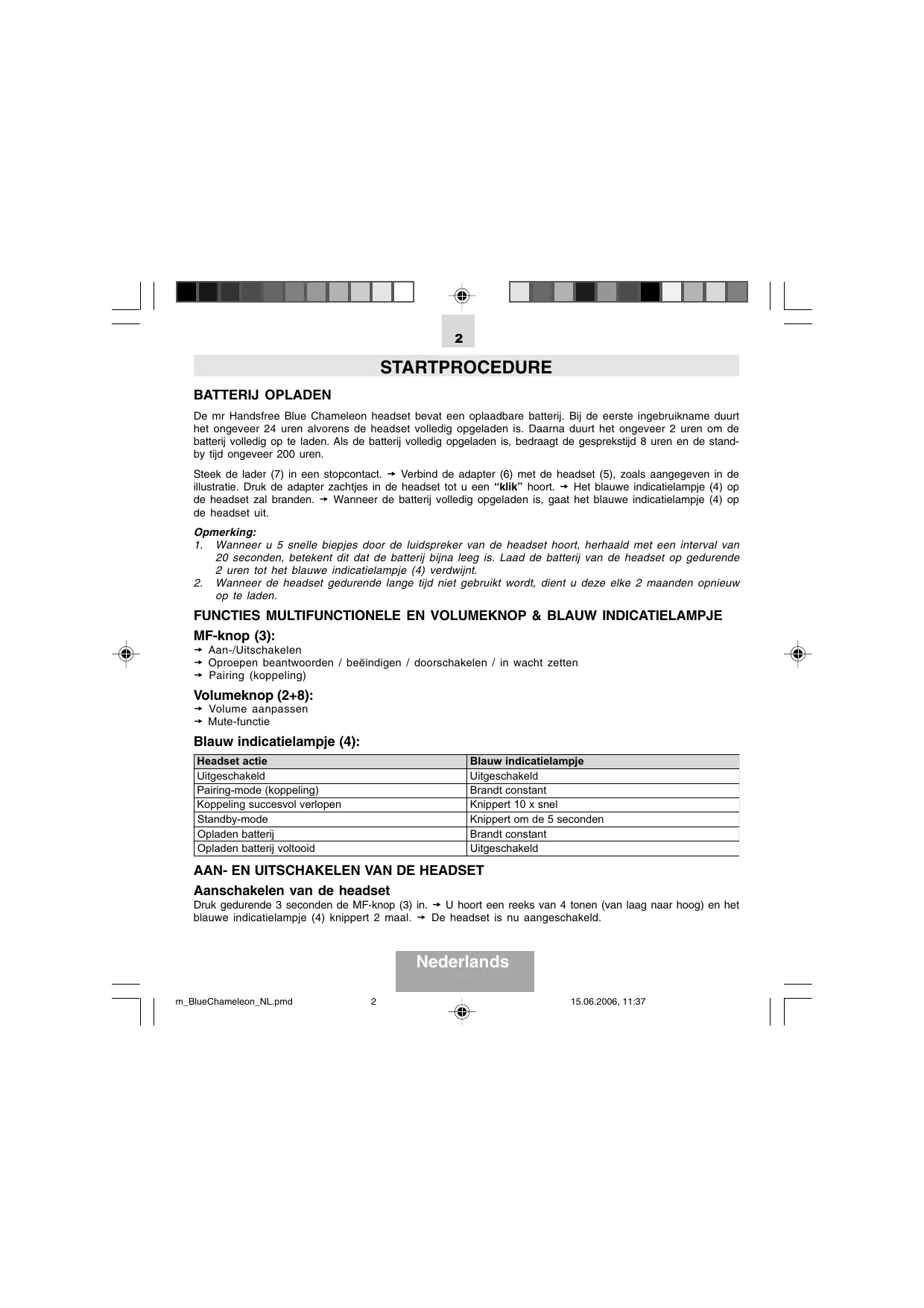 Aanschakelen van de headset Druk gedurende 3 seconden de MF-knop (3) in. U hoort een reeks van 4 tonen (van laag naar hoog) en het blauwe indicatielampje (4) knippert 2 maal. De headset is nu aangeschakeld. Nederlands m_BlueChameleon_NL.pmd